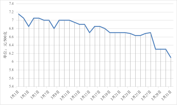 从监测数据来看,猪肉月均价为13.23元/500克,环比下跌6.44%。生猪价格小幅下跌,从3月1日7.15元/500克下跌至3月31日6.10元/500克。主要原因是:终端市场需求平淡,需求消化能力有限,供大于求带动生猪价格继续下跌。后市来看,国家层面已启动政府猪肉储备临时储备收储工作,猪肉价格将止跌回稳。