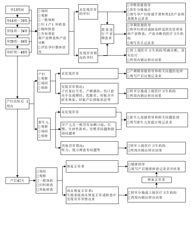 1.镇(中心)卫生院、社区卫生服务中心为正常产妇做产后健康检查,异常产妇到原分娩医疗卫生机构检查。