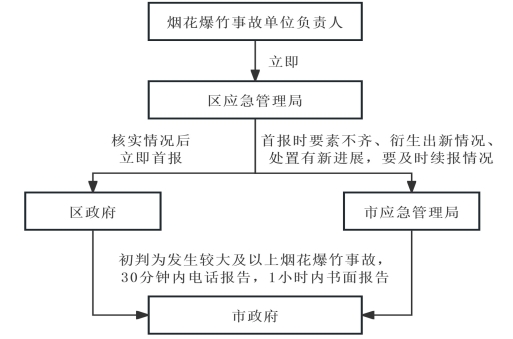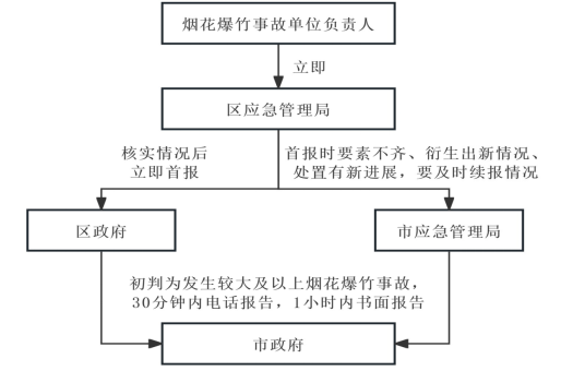 烟花爆竹事故发生后,事发单位立即向区应急管理局和属地镇政府(街道办事处)报告事态发展情况和先期处置情况,区应急管理局核实事故情况,及时向区委、区政府和市应急管理局报告。初判为发生较大及以上烟花爆竹事故的,区委、区政府在30分钟内向市委、市政府电话报告,在1小时内向市委、市政府书面报告。