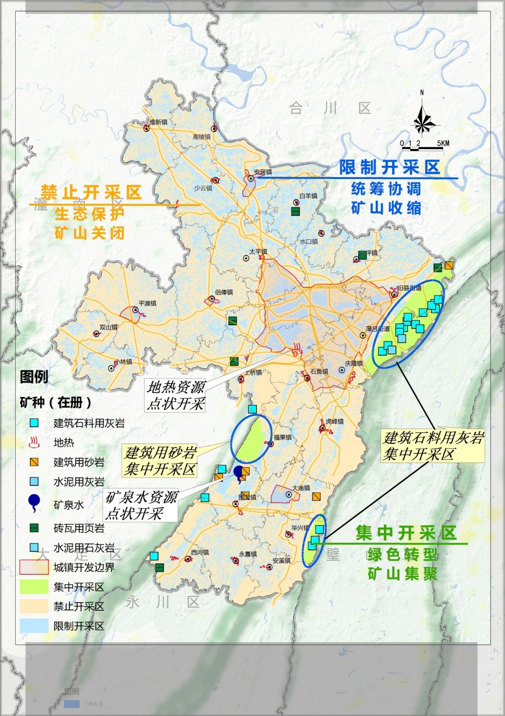 分区管控,优化布局。划定禁止开采区。以评估优化后的生态保护红线、自然保护地、永久基本农田,交通干线100m范围内为标准,划定矿产资源禁止开采区,禁止所有矿产资源开采,现有矿山原则上不再增划资源,出让合同到期后依法退出。划定集中开采区。根据铜梁区矿山分布特点和矿业发展实际情况,规划矿产资源集中开采区3个,分别为旧县-蒲吕石灰岩集中开采区、华兴石灰岩集中开采区、福果矿业经济区,重点保障重庆主城周边碎石供给。划定限制开采区。限制矿产资源开采,既有矿山收缩或有序退出重要矿产开发区域。