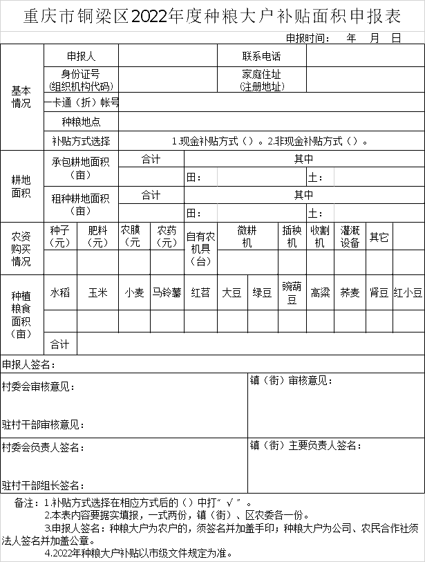 1.申报备案及村级审查、公示。种粮大户本人按照本通知相关要求自愿申报2022年补贴面积(按程序核定的2021年实际种粮面积),粮食作物种植面积经村社审查认可后由镇(街)统一部署在本村社人口集中地进行村级公示,公示必须按照统一格式印制张贴,具体内容包括:种粮大户姓名、种粮地点、种植作物、面积和区农业农村委监督电话45695335、区财政局监督电话45682129,公示时间不少于7天,对有异议的,重新查实审核后再公示,直至群众认可(下同)。公示无异议后经驻村干部审核签字、村委会签署意见后,于2021年10月15日前向耕种所在地的镇街申报,如实填报《重庆市铜梁区2022年度种粮大户补贴面积申报表》(附件3)。