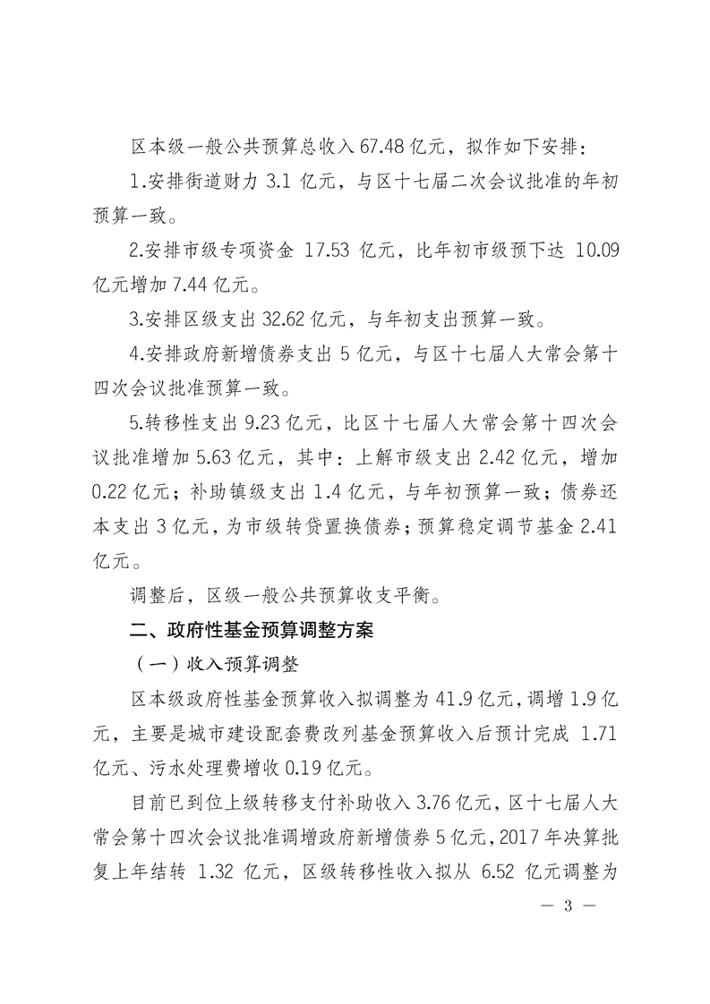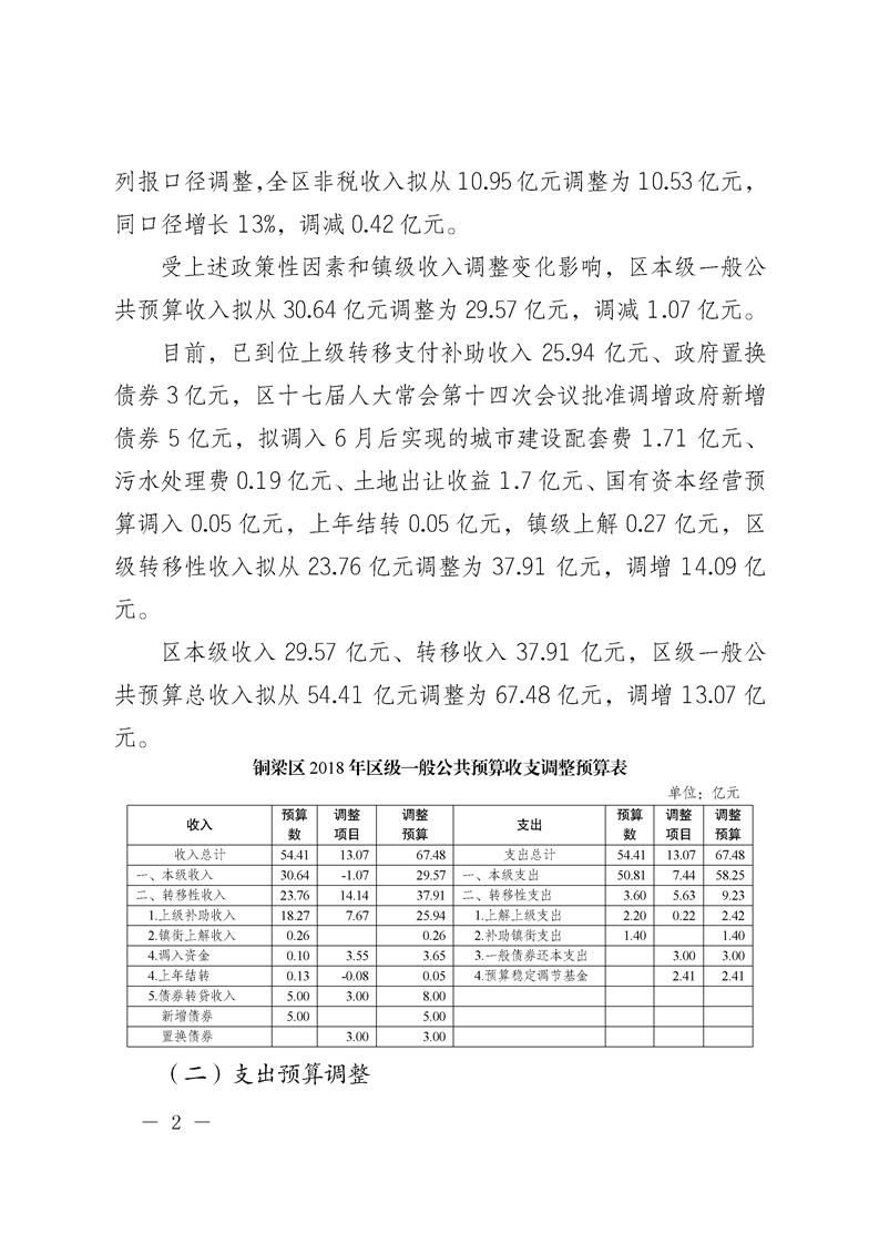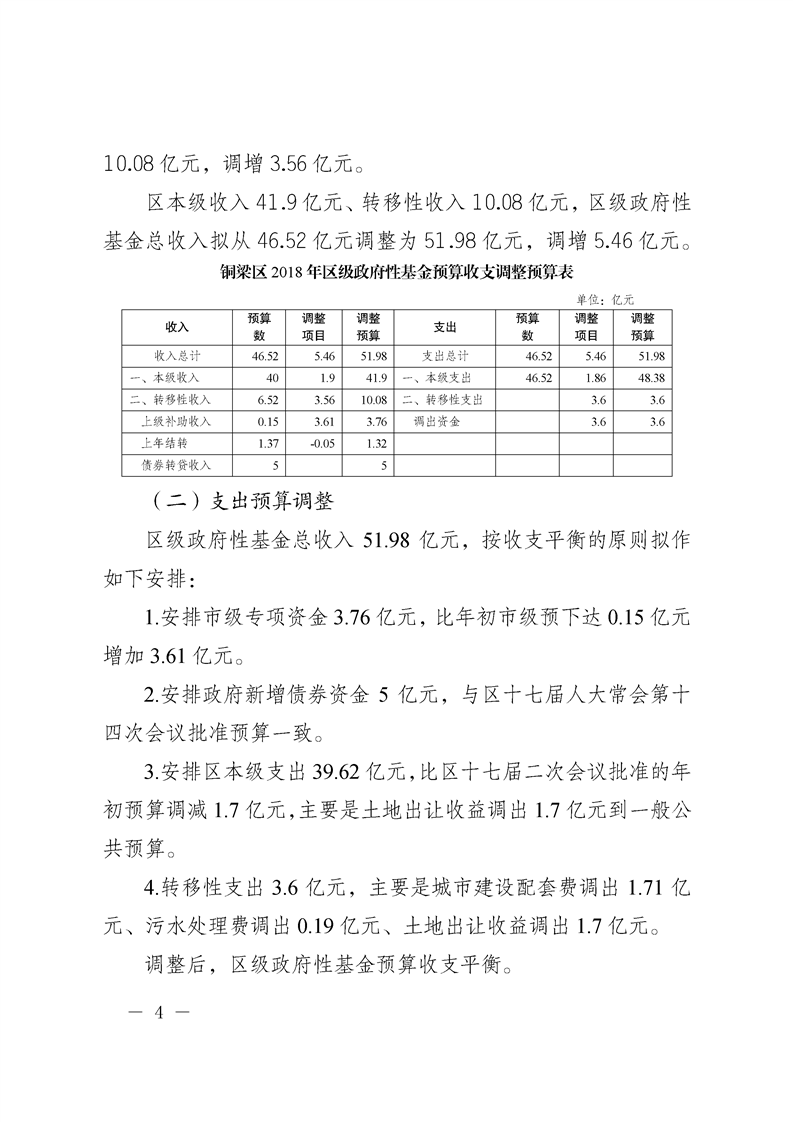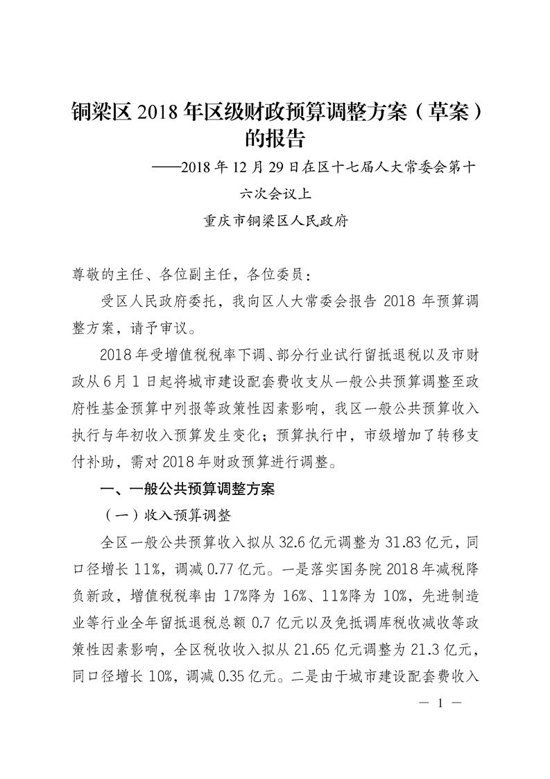 铜梁区2018年区级财政预算调整方案(草案)的报告