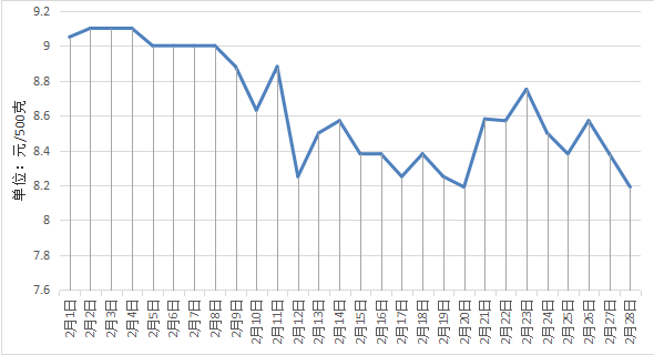 从监测数据来看,猪肉月均价为17.77元/500克,环比上涨1.08%。生猪价格小幅下跌,从2月1日9.05元/500克下跌至2月28日8.19元/500克。主要原因是:养殖端看涨预期降低而积极出栏,供应增量,同时需求端跟进乏力,供多需少拖累猪价下滑。后市来看,随着养殖端出栏恢复,供应端预期增量,猪价或止涨回落。