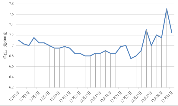 从监测数据来看,猪肉月均价为13.80元/500克,环比上涨1.85%。生猪价格止跌回升,从12月1日7.10元/500克上涨至12月31日7.25元/500克。主要原因是:随着腌腊需求增加,群众消费量大幅增加。随着后期春节备货需求提升,猪价或继续回升。