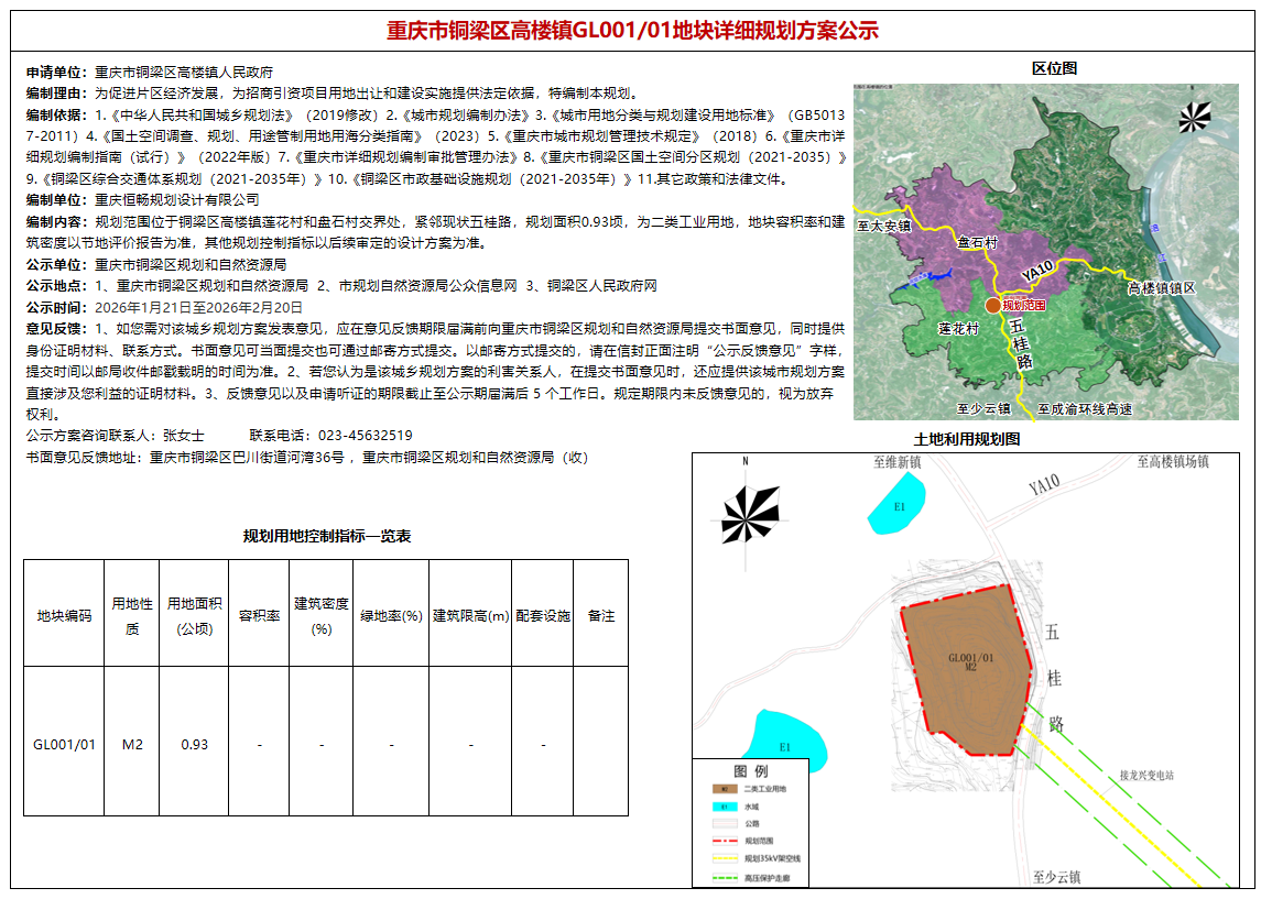 重庆市铜梁区高楼镇GL001/01地块详细规划方案公示