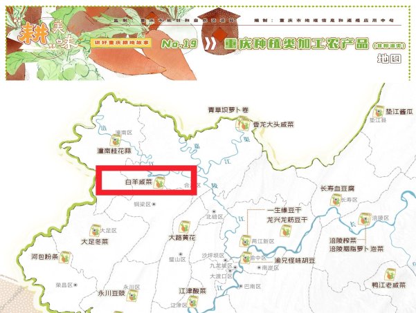 近日,重庆市地理信息和遥感应用中心发布《重庆种植类加工农产品地图》,铜梁区的这张“咸香名片”——白羊咸菜,以其独特的制作工艺和鲜明的地方特色上榜。这款生于耕地、成于匠人的巴渝风味,正在乡村振兴的时代东风中“腌”出幸福味道。