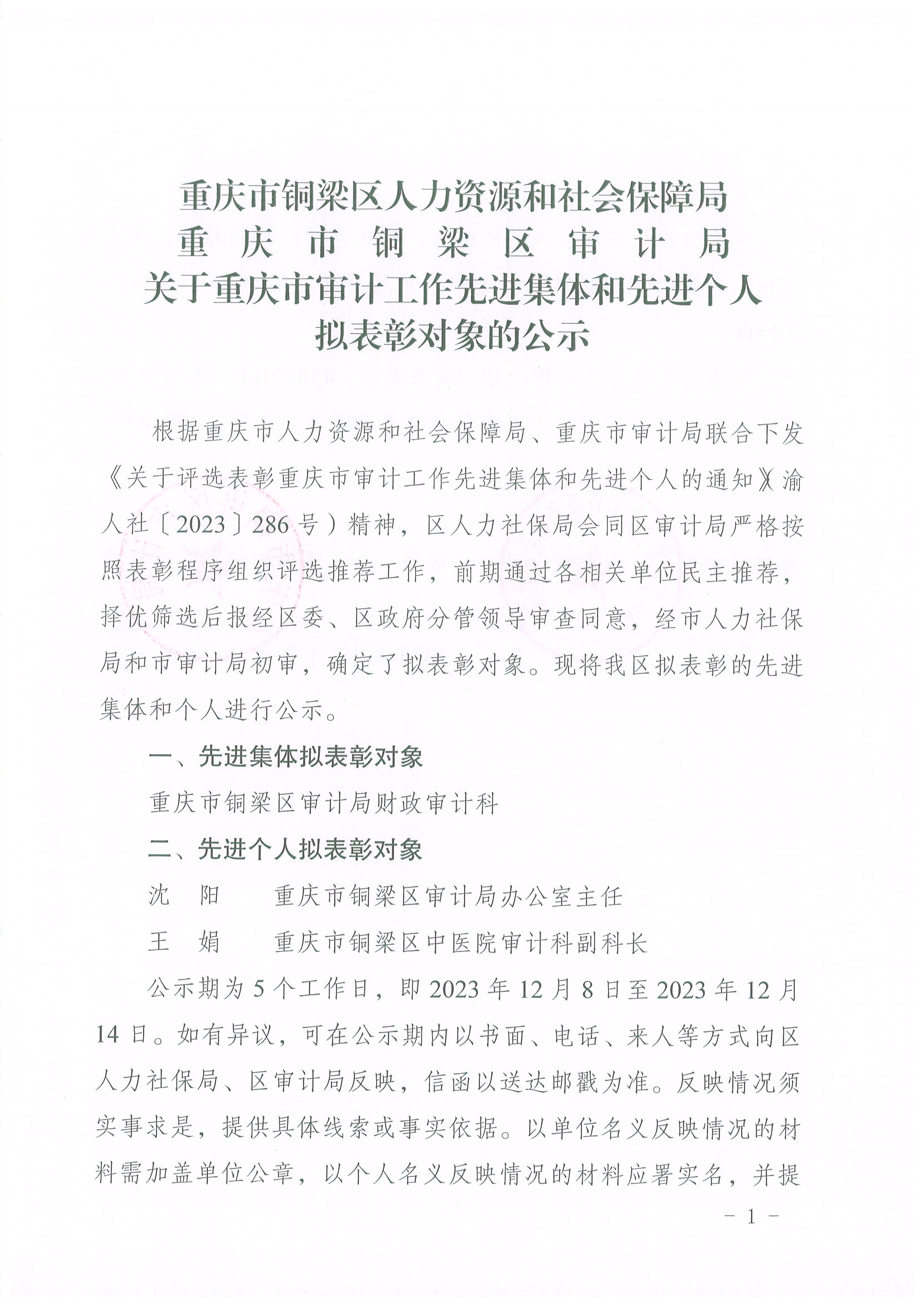 根据重庆市人力资源和社会保障局、重庆市审计局联合下发《关于评选表彰重庆市审计工作先进集体和先进个人的通知》(渝人社〔2023〕286号)精神,区人力社保局会同区审计局严格按照表彰程序组织评选推荐工作,前期通过各相关单位民主推荐,择优筛选后报经区委、区政府分管领导审查同意,经市人力社保局和市审计局初审,确定了拟表彰对象。现将我区拟表彰的先进集体和个人进行公示。