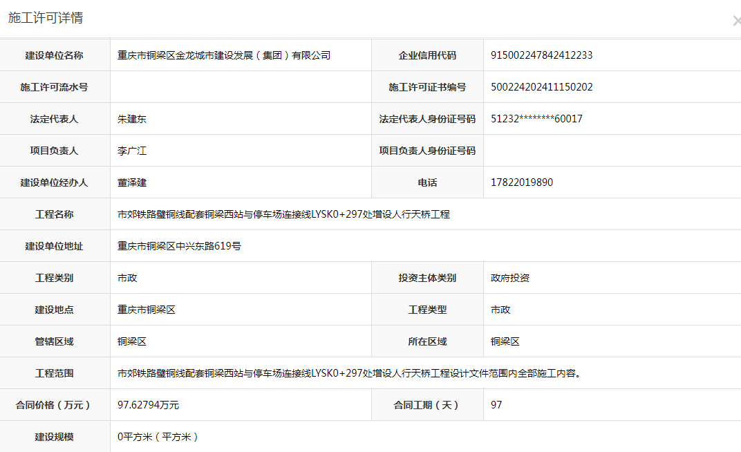 市郊铁路璧铜线配套铜梁西站与停车场连接线LYSK0+297处增设人行天桥工程施工许可