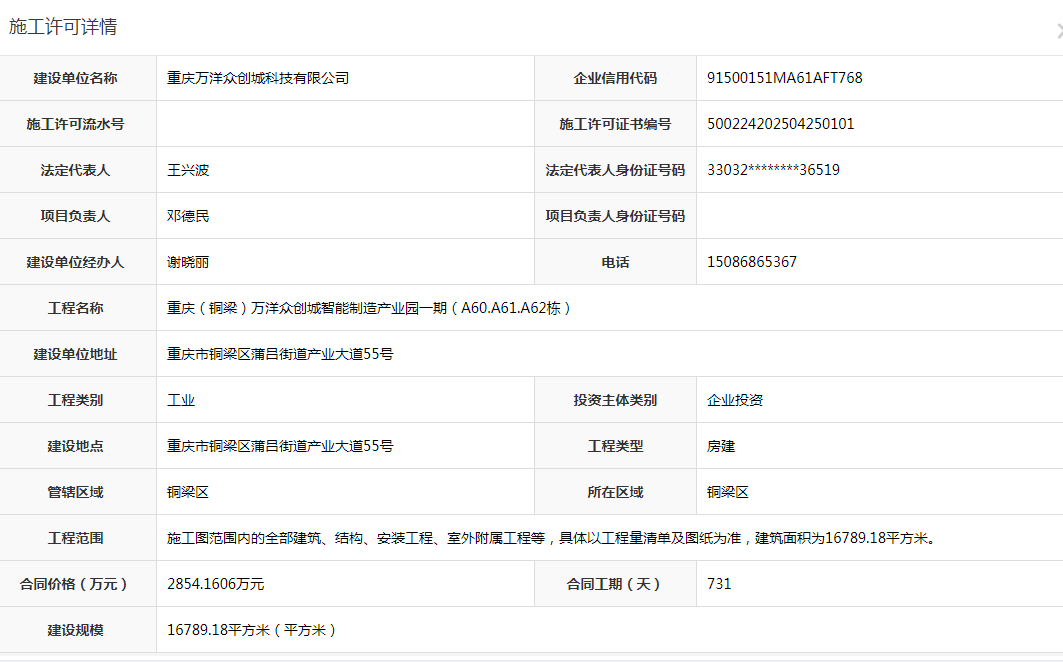 重庆(铜梁)万洋众创城智能制造产业园一期(A60.A61.A62栋)施工许可