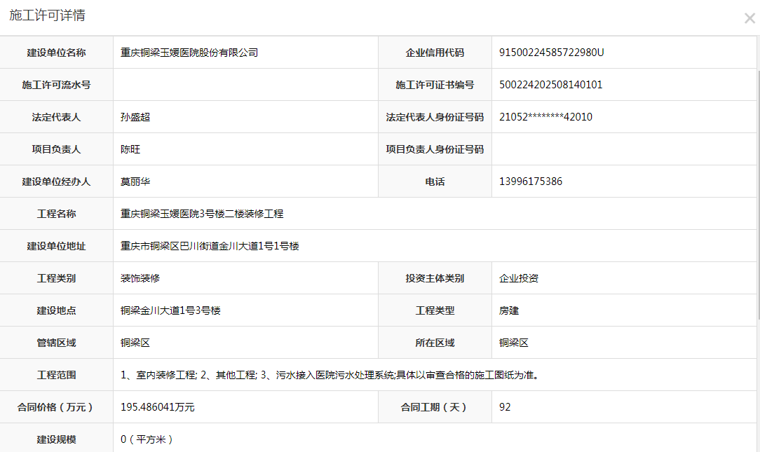 重庆铜梁玉媛医院3号楼二楼装修工程施工许可