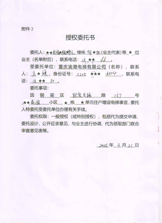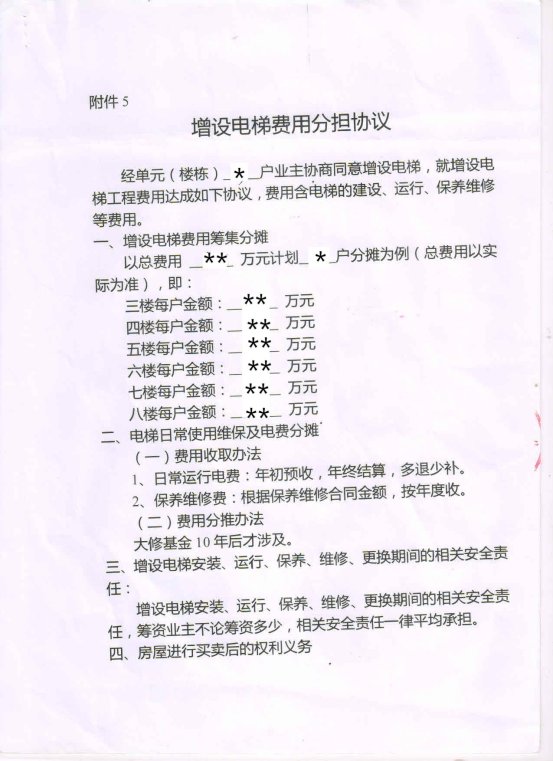 附件:1.书面申请;2.授权委托书;3.增设电梯示意图;4.业主书面同意意见;5.增设电梯协议书。