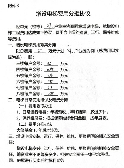 附件:1.书面申请、2.相关合格书、3.增设电梯示意图、4.业主书面同意意见、5.费用分担协议。