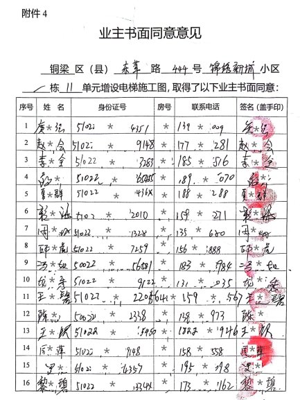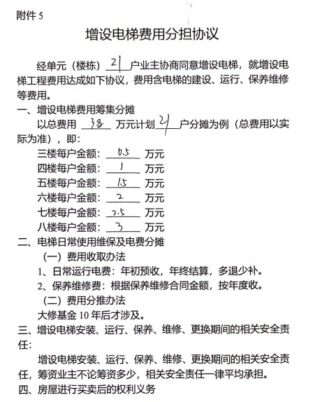 附件:1.书面申请、2.相关合格书、3.增设电梯示意图、4.业主书面同意意见、5.费用分担协议。