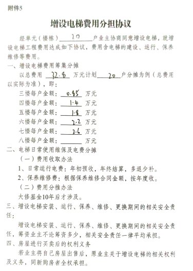 附件:1.书面申请;2.相关合格书;3.增设电梯示意图;4.业主书面同意意见。5.费用分担协议。