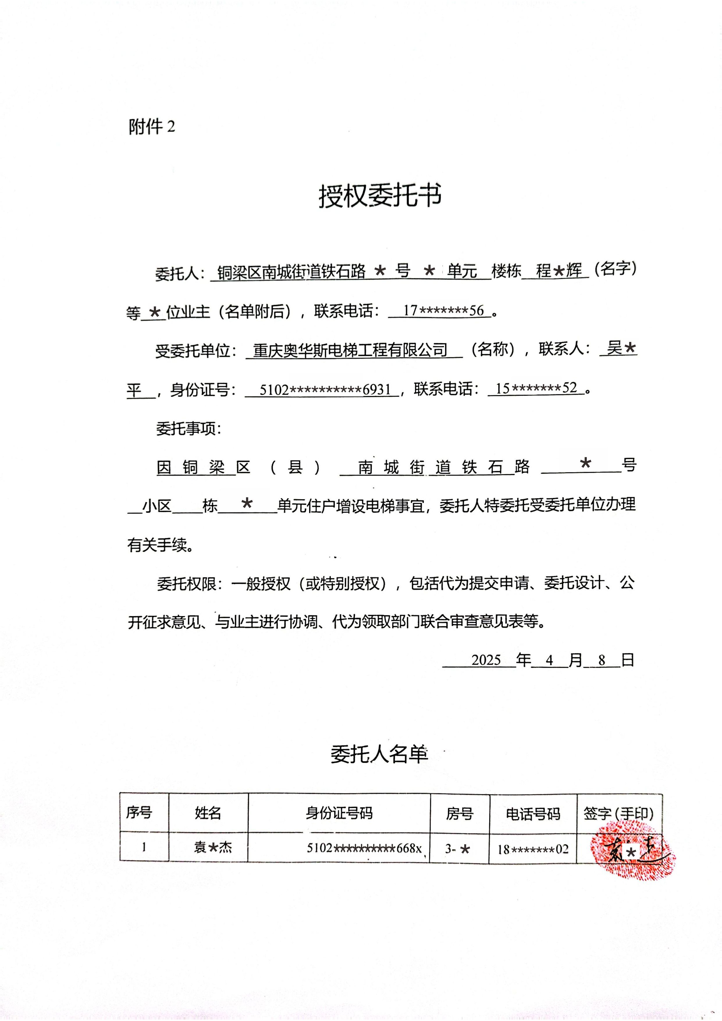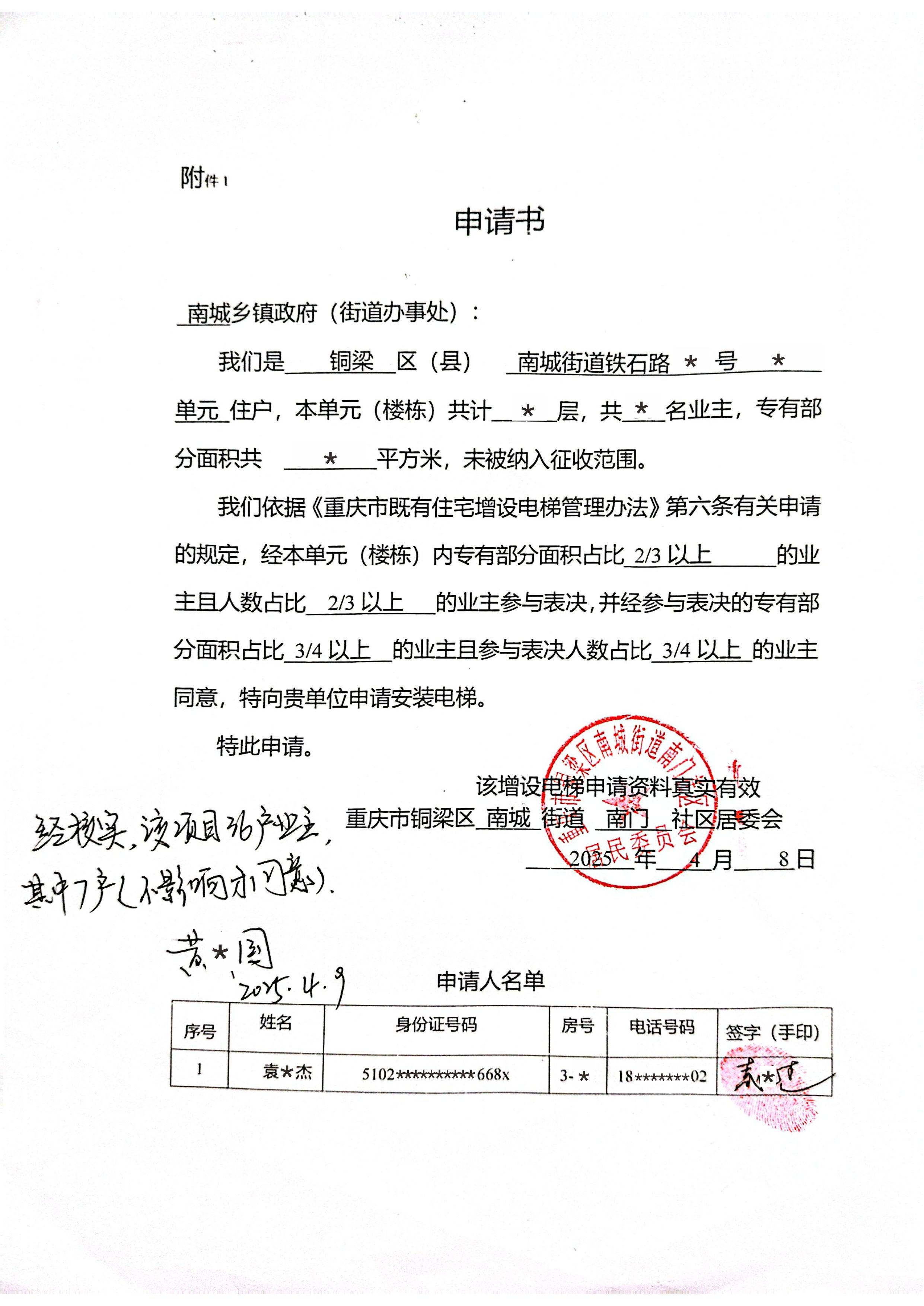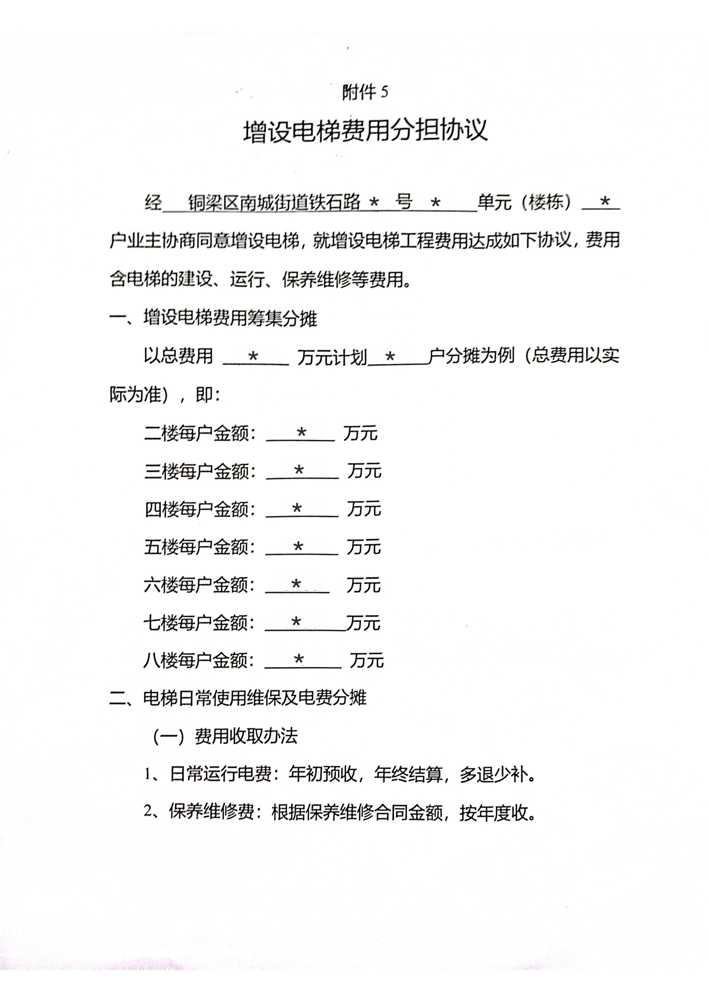 附件:1.书面申请;2.授权委托书;3.增设电梯示意图;4.业主书面同意意见;5.增设电梯费用分摊协议。