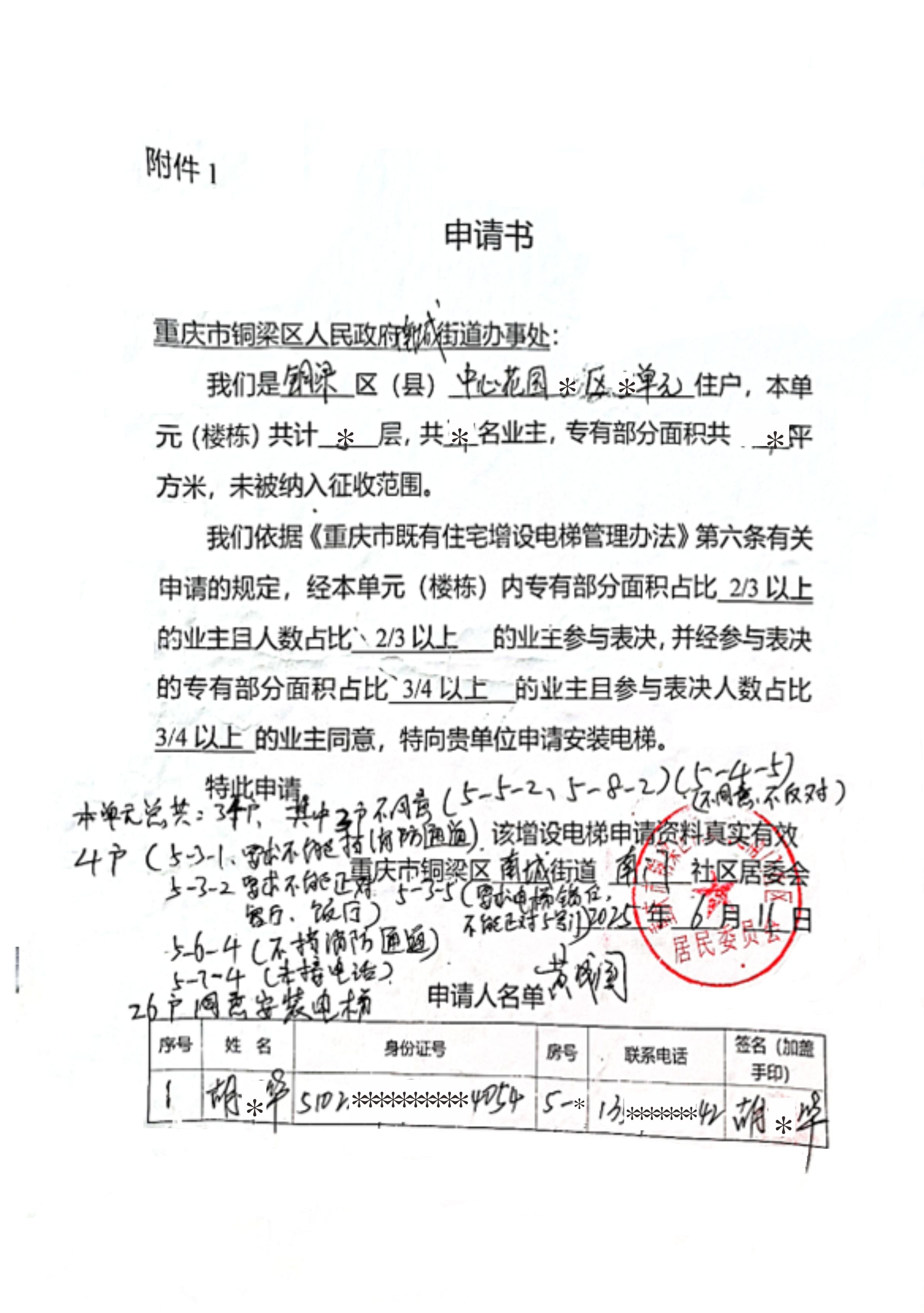近日,铜梁区南城街道中心花园*区*单元胡*华等26户业主向铜梁区南城街道办事处提出申请增设电梯,现将铜梁区南城街道中心花园*区*单元增设电梯项目的相关情况公示如下:
