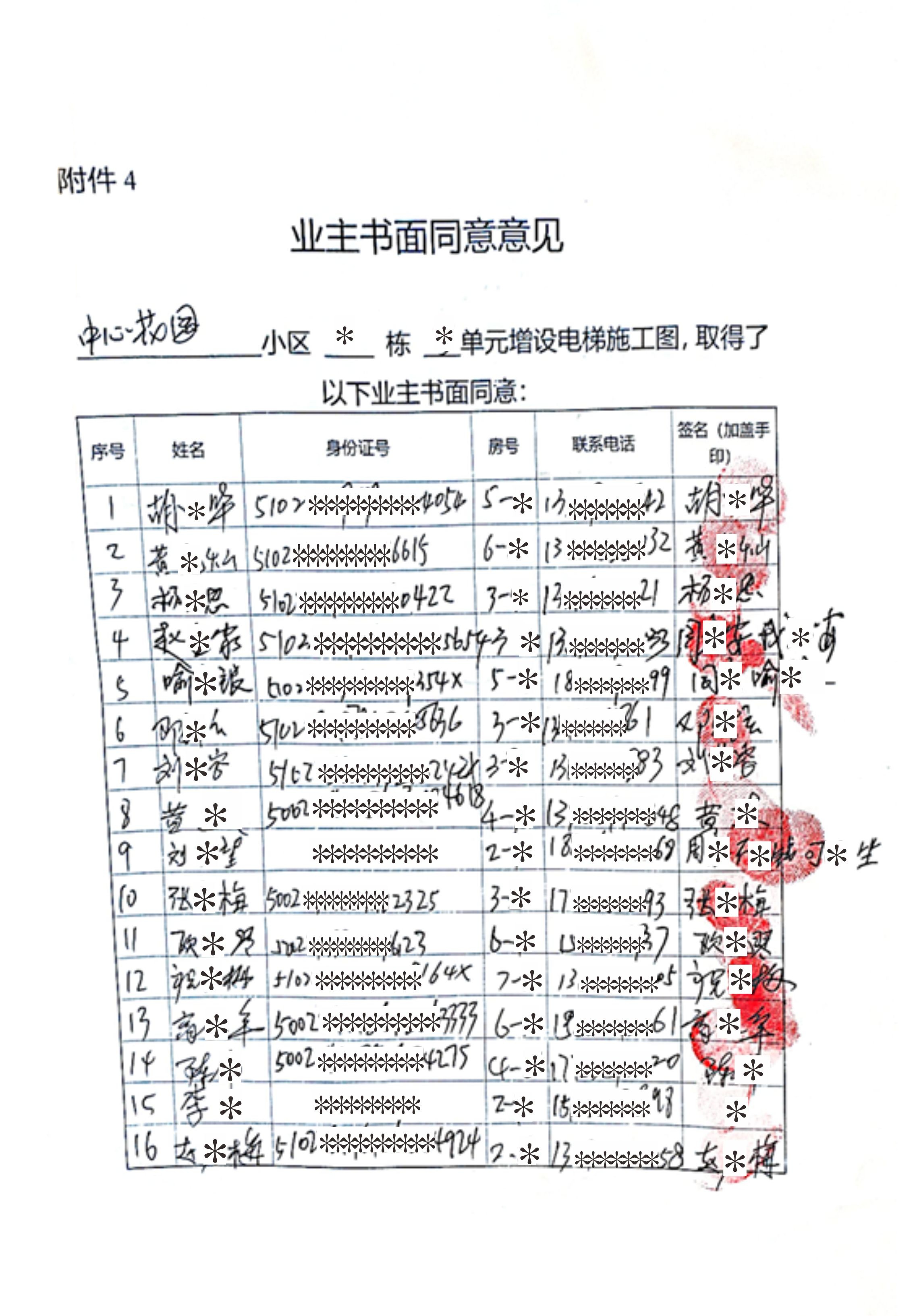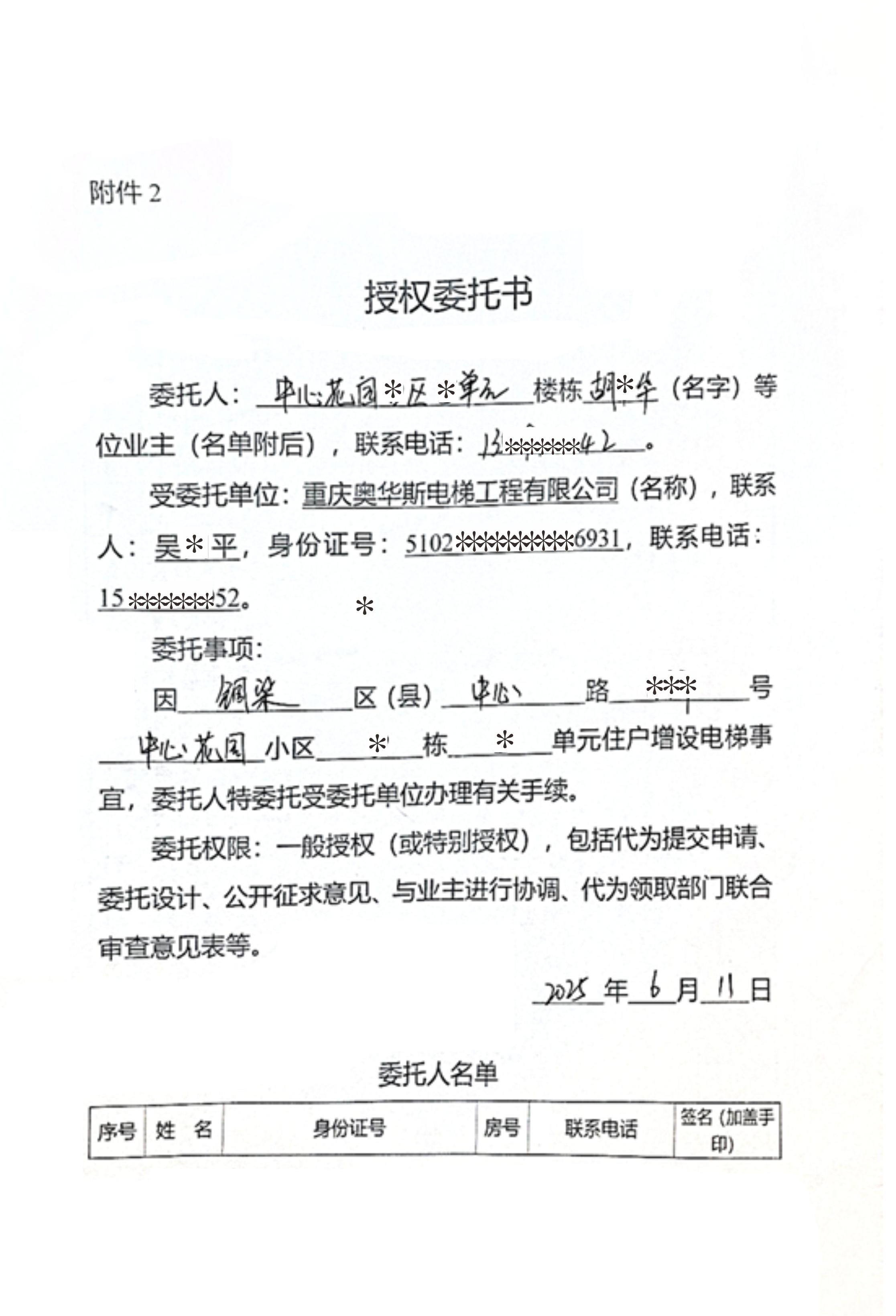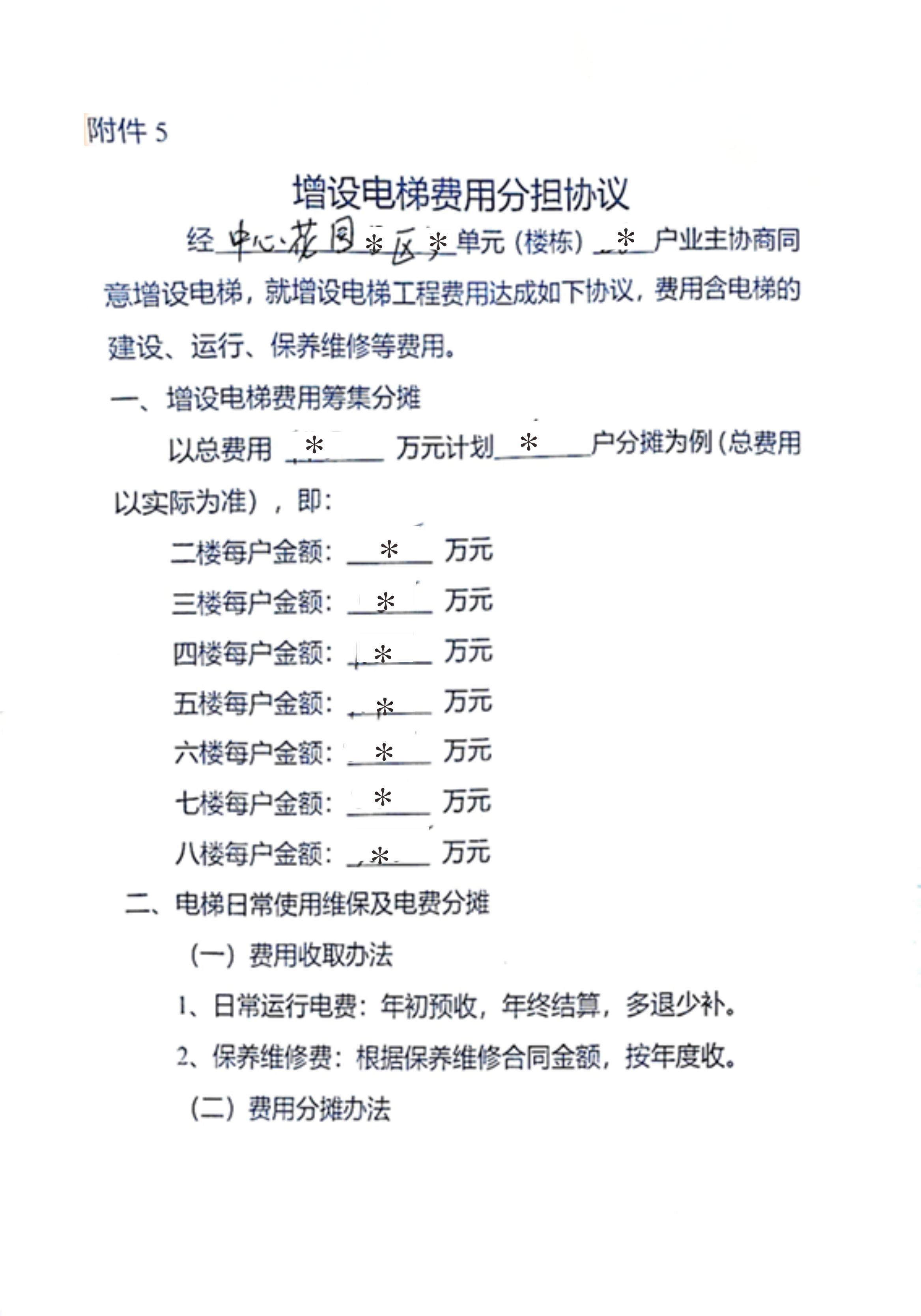 附件:1.书面申请;2.授权委托书;3.增设电梯示意图;4.业主书面同意意见;5.增设电梯费用分摊协议。