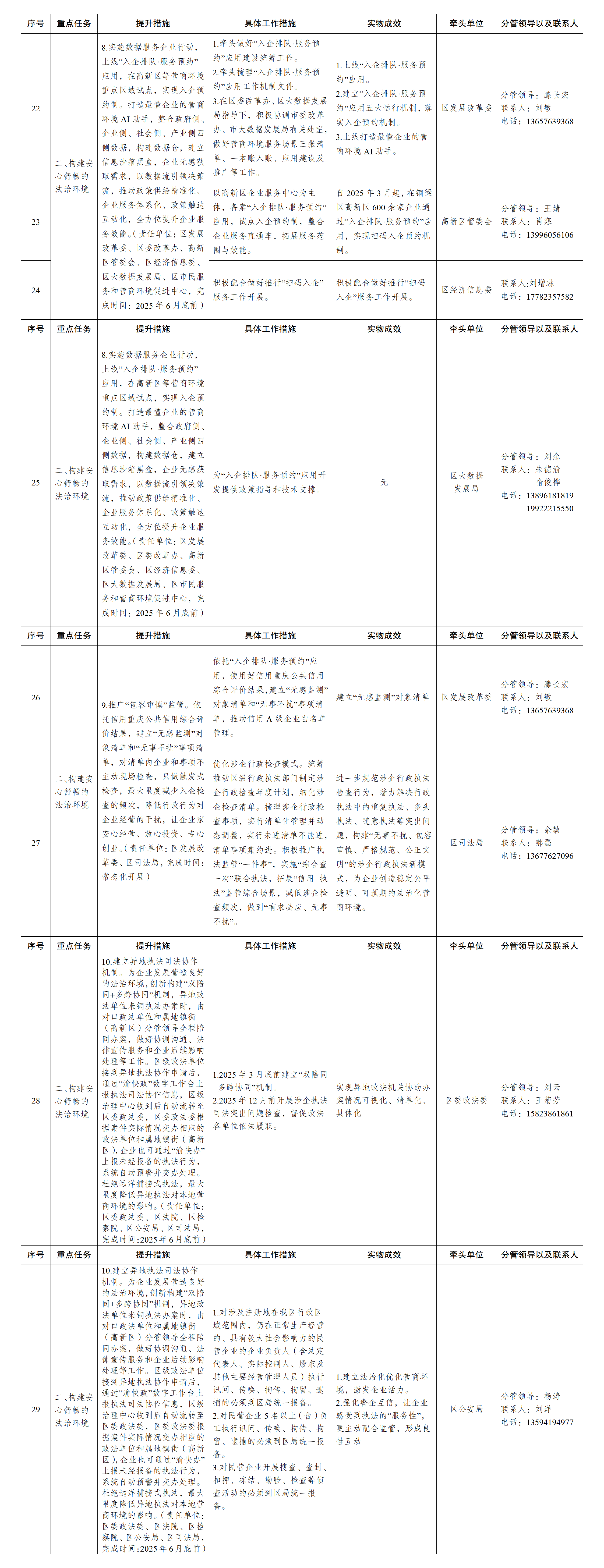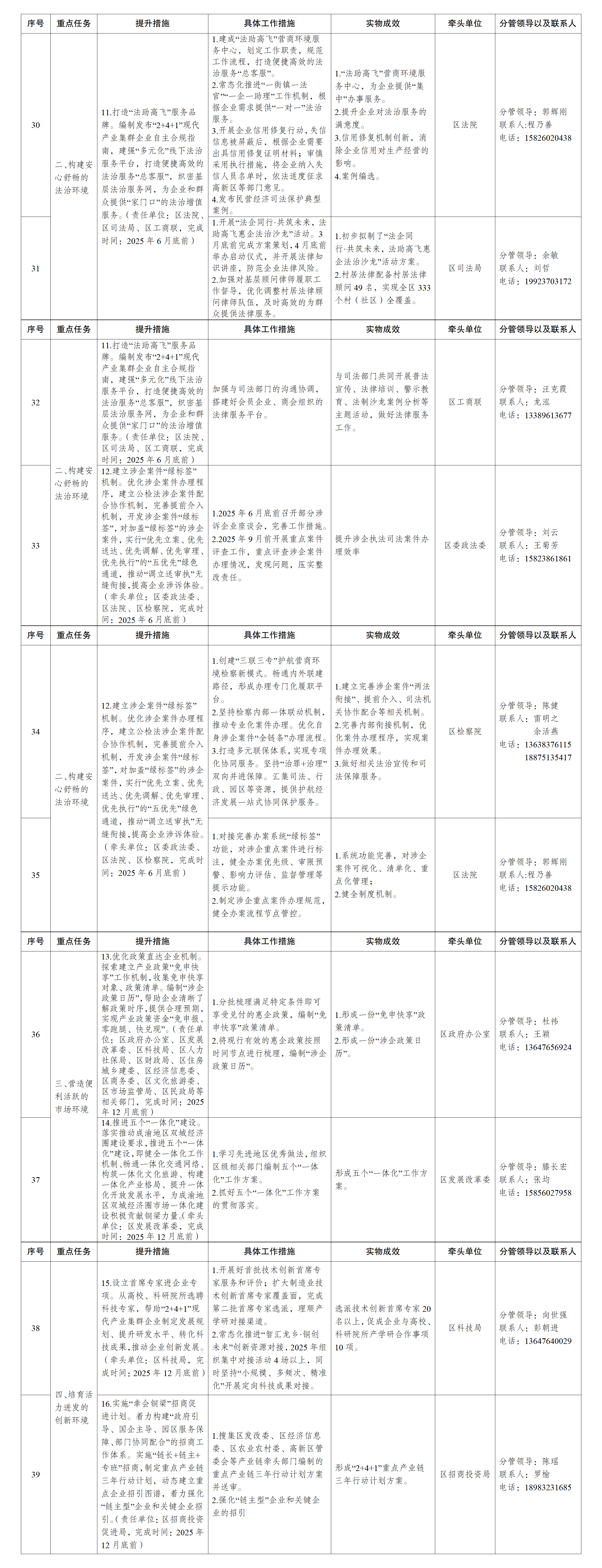 1.建立区级领导干部“四联系”工作机制(企业商会、项目、专家人才、镇街)。健全完善区级领导干部联系企业家制度,组建“亲清服务团”,打造党政亲商恳谈会品牌,建立“收集-交办-督办-反馈”闭环管理机制,畅通政企沟通渠道,推动政务服务向精准化、效能化转型升级。(责任单位:区委办公室、区政府办公室、区委统战部、区经济信息委、区工商联、高新区管委会,完成时间:常态化开展)