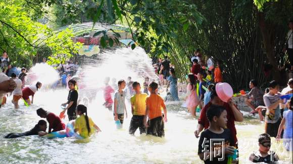 开幕式上,现场到处彩旗飘扬、鲜花环绕。精彩的文艺曲目表演和欢乐的泼水活动得到了市民游客们的阵阵掌声以及主动参与,不停将现场氛围带入高潮。在开幕式现场周边的各处景点内,许多市民游客在河道内一起共情戏水、在沙石堆来回奔跑玩耍、在瀑布下感受飞流直下……处处呈现出惬意欢快的幸福景象。