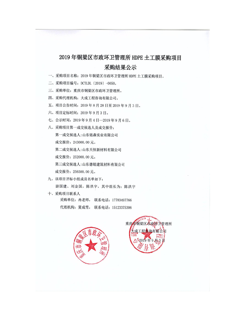 2019年铜梁区环卫管理所HDPE土工膜采购项目采购结果公示