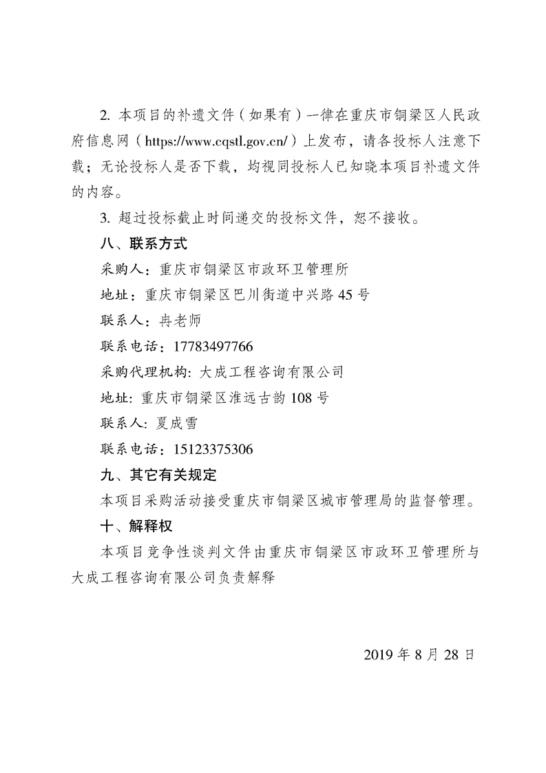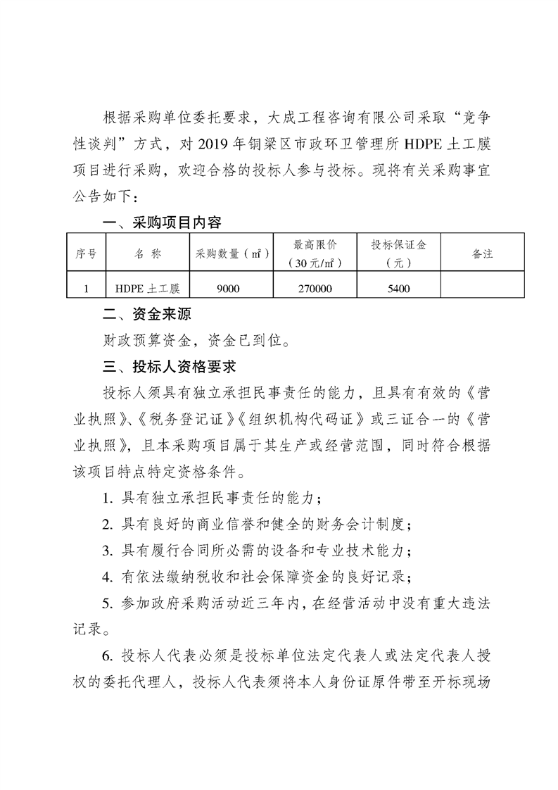 2019年铜梁区市政环卫管理所HDPE土工膜采购项目采购公告