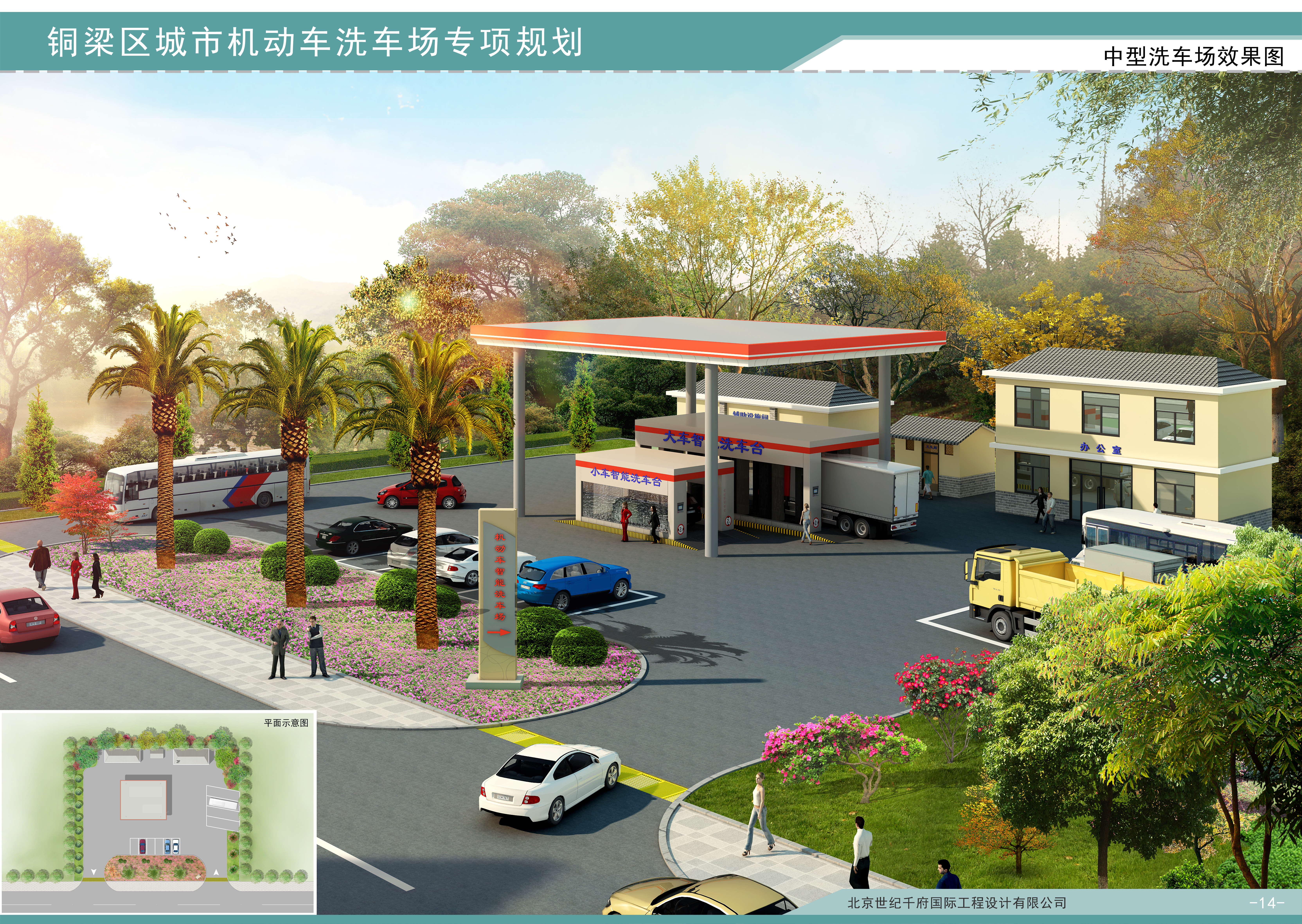 西部综合洗车场:位于重庆三环高速铜梁西下道口南侧,用地3000平方米,该用地目前在现行控制性详细规划范围以外(需调整用地类型)。规划洗车供给规模为500辆/日。规划采用一体化智能设备,可以对大、中、小型客货车辆进行清洗。