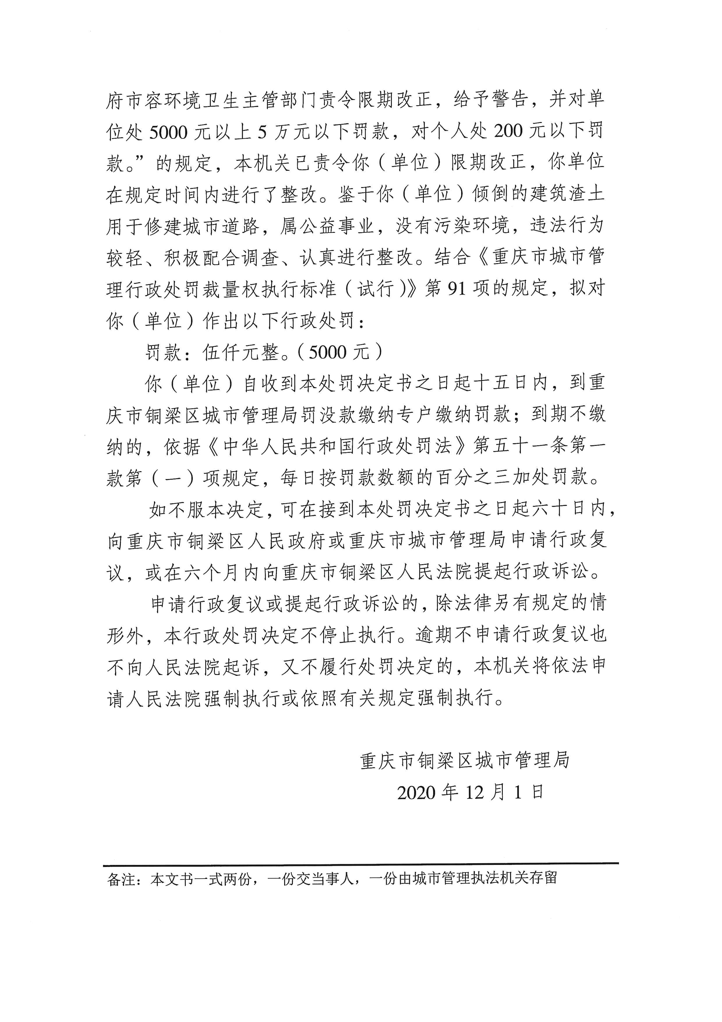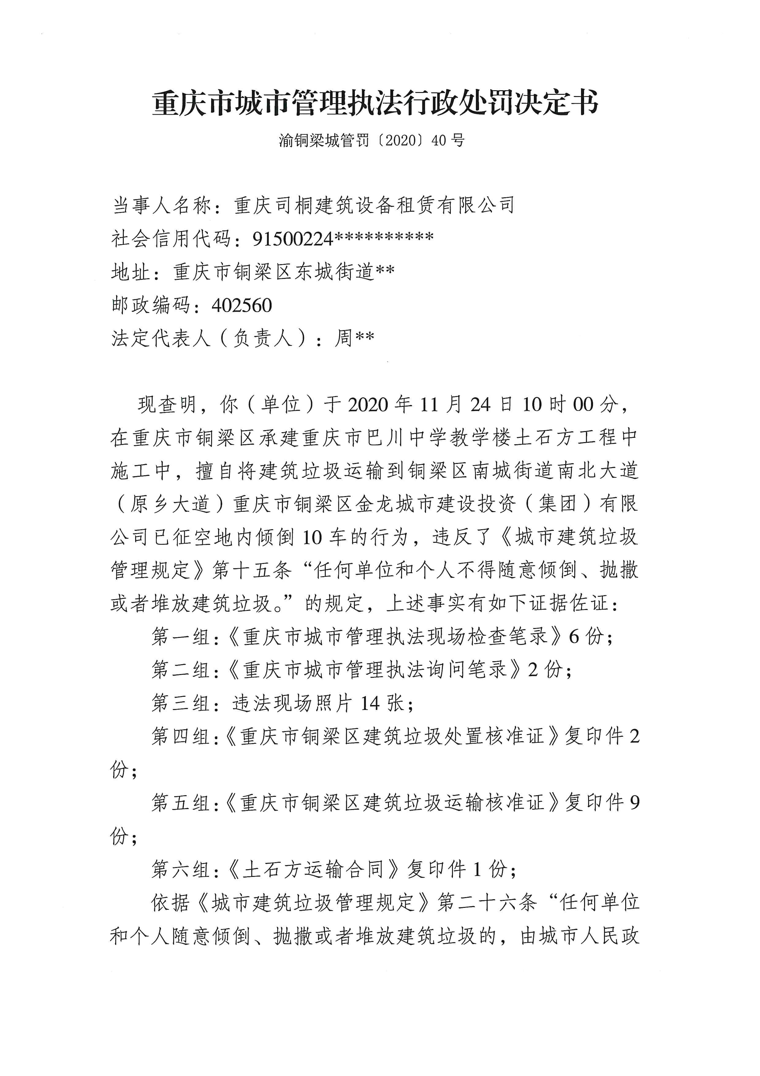 重庆市铜梁区城市管理执法行政处罚公开(渝铜梁城管罚〔2020〕40号)