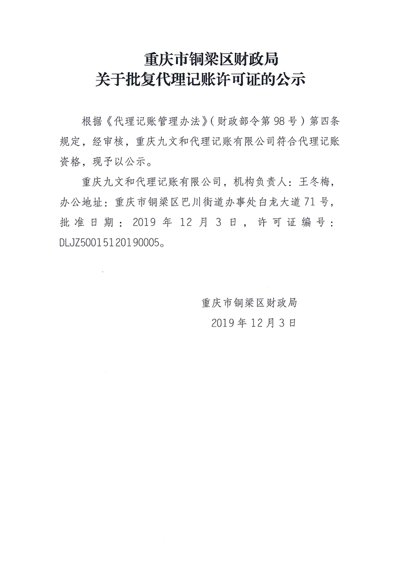 重庆市铜梁区财政局关于批复代理记账许可证的公示