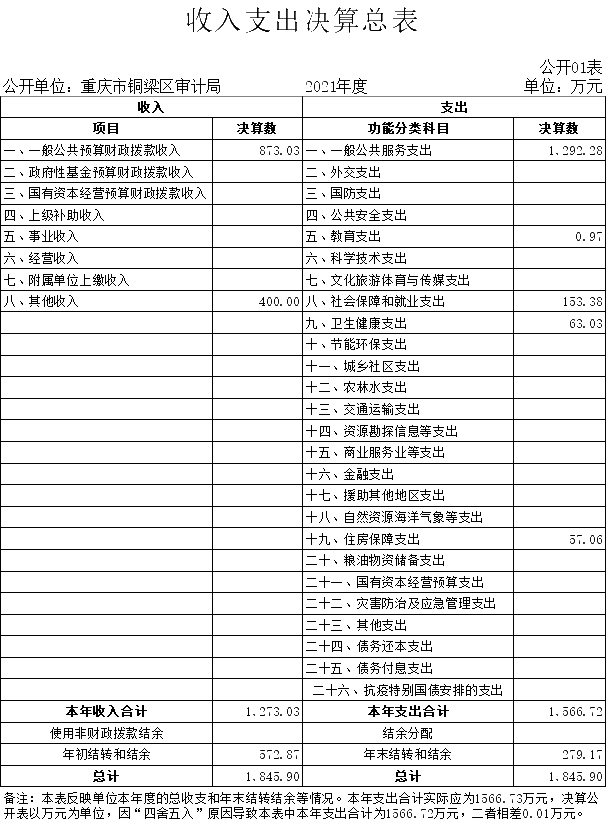 1.总体情况。2021年度收入总计1,845.90万元,支出总计1,845.90万元。收支较上年决算数减少605.50万元、下降24.7%,主要原因是非同级财政减少固定资产投资结算审计拨款。收入总计包括本年收入合计1273.03万元、年初结转和结余572.87万元,支出总计包括本年支出合计1566.73万元、年末结转和结余279.17万元。