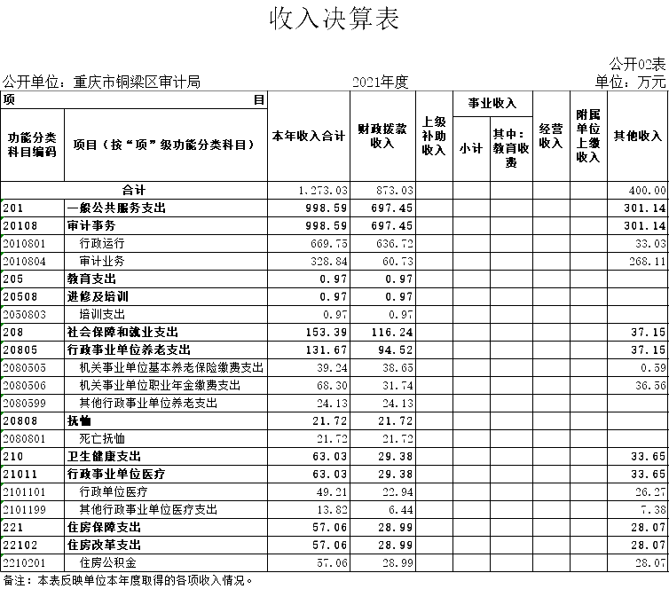 2.收入情况。2021年度收入合计1,273.03万元,较上年决算数减少721.74万元,下降36.2%,主要原因是非同级财政减少固定资产投资结算审计拨款。其中:财政拨款收入873.03万元,占68.6%;其他收入400.00万元,占31.4%。此外,年初结转和结余572.87万元。