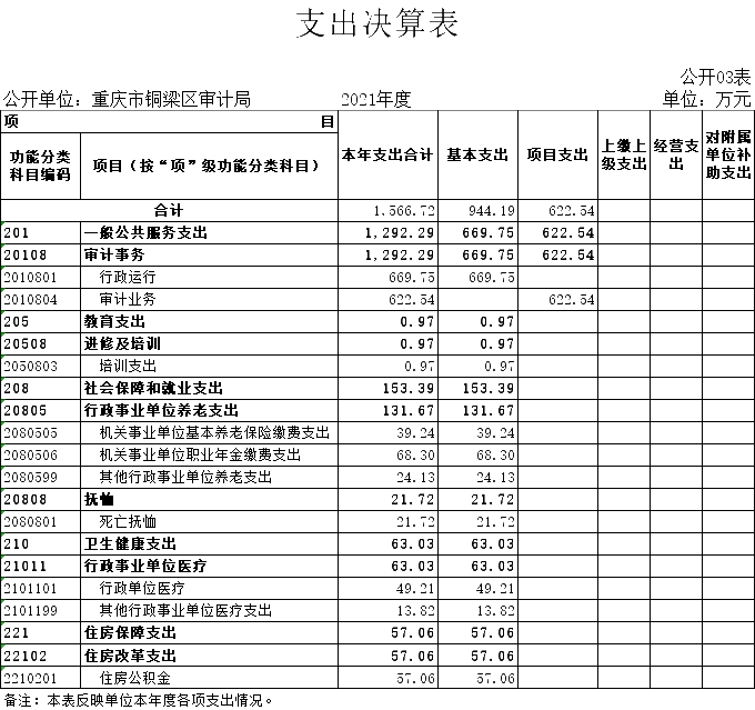 3.支出情况。2021年度支出合计1,566.73万元,较上年决算数减少311.81万元,下降16.6%,主要原因是减少固定资产投资结算审计委托业务费。其中:基本支出944.19万元,占60.3%;项目支出622.54万元,占39.7%。
