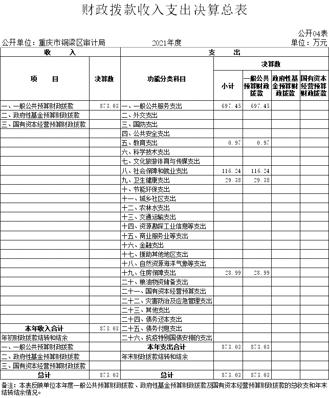 2021年度财政拨款收、支总计873.03万元。与2020年相比,财政拨款收、支总计各增加181.33万元,增长26.2%。主要原因是财政追加2020年度目标绩效奖及职业年金清算记实预算。