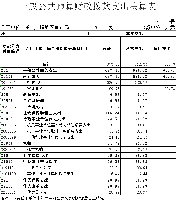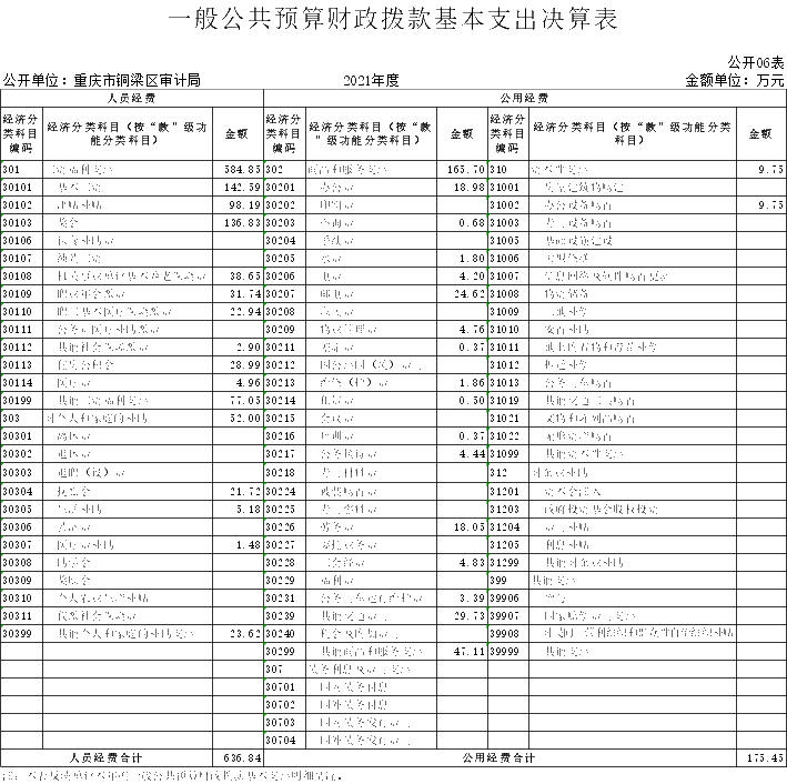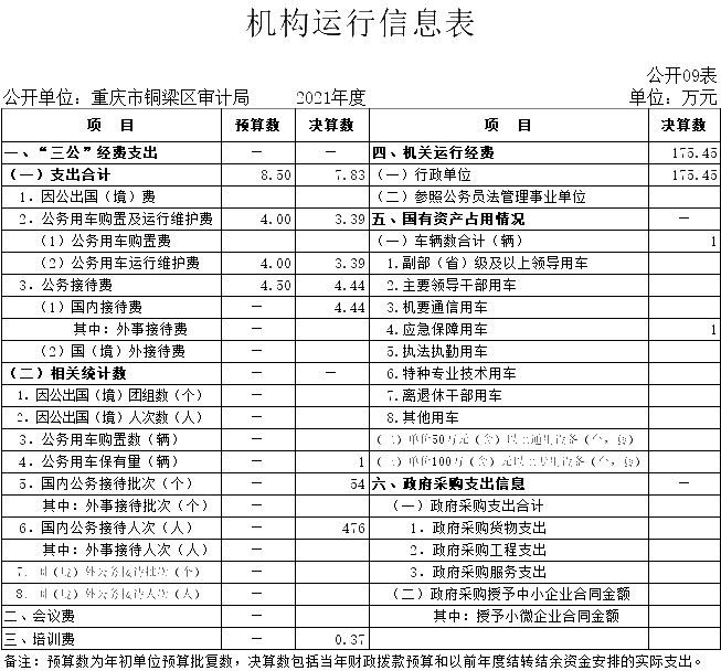 从预算单位构成看,纳入本单位2021年度决算编制的二级预算单位包括重庆市铜梁区审计局和重庆市铜梁区审计中心。重庆市铜梁区审计中心未独立核算,相关数据并入局机关账套统一核算,并统一编制决算报表。