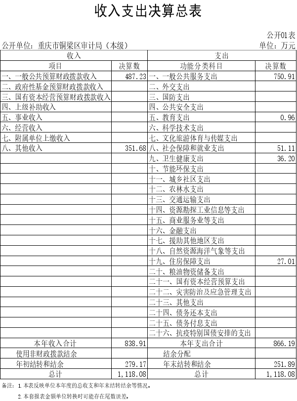 1. 总体情况。2022年度收入总计1,118.08万元,支出总计1,118.08万元。因本单位2021年未单独建账进行会计核算,故收支较上年决算数无对比数据。收入总计包括本年收入合计838.91万元、年初结转和结余279.17万元,支出总计包括本年支出合计866.19万元、年末结转和结余251.89万元。