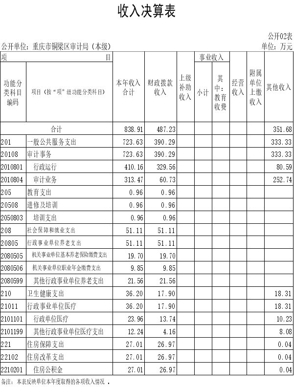 2. 收入情况。2022年度收入合计838.91万元,因本单位2021年未单独建账进行会计核算,故收入较上年决算数无对比数。其中:财政拨款收入487.23万元。占58.1%;其他收入351.68万元,占41.9%。此外,年初结转和结余279.17万元。