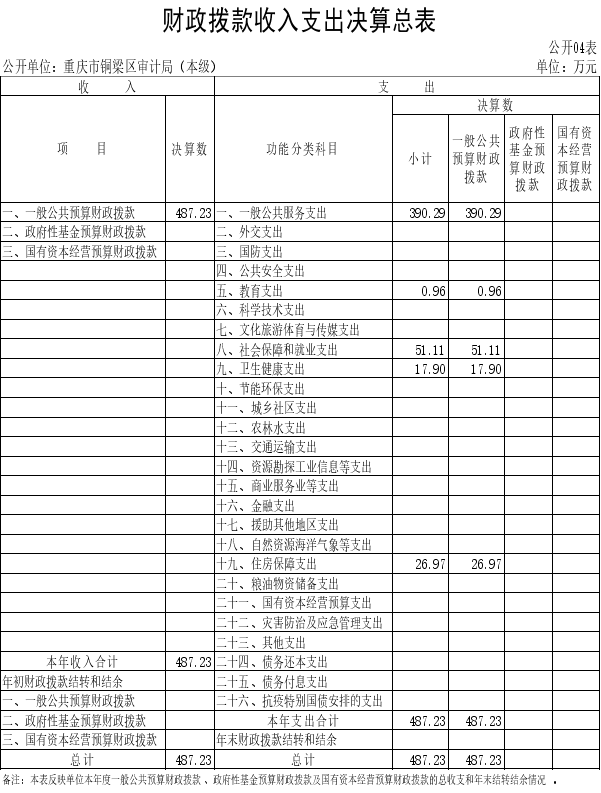 2022年度财政拨款收、支总计487.23万元。因本单位2021年未单独建账进行会计核算,故财政拨款收支总计较上年决算数无对比数据。