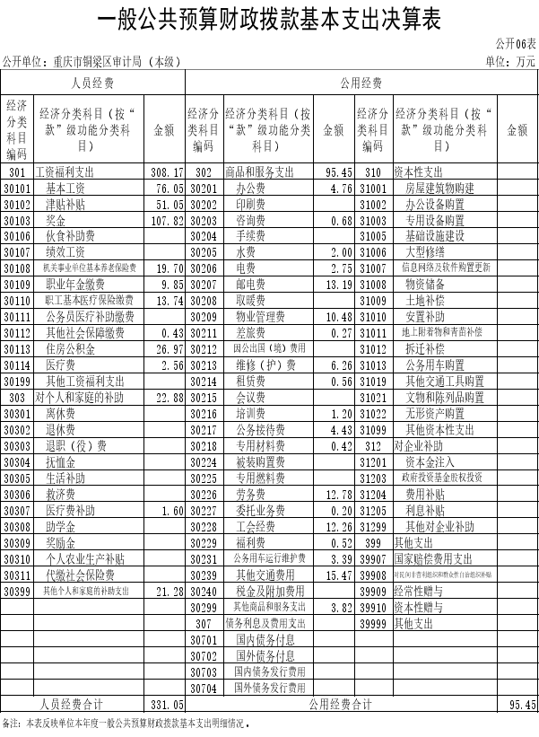 2022年度一般公共财政拨款基本支出426.5万元。其中:人员经费331.05万元,人员经费用途主要包括工资福利支出308.17万元、对个人和家庭的补助22.88万元。公用经费95.45万元,公用经费用途均为商品和服务支出95.45万元。本单位2021年未单独建账核算,故人员经费、公用经费较上年决算数均无对比数据。