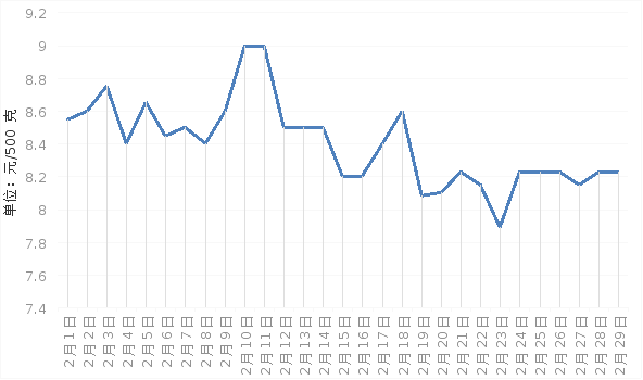从监测数据来看,猪肉月均价为16.41元/500克,环比上涨4.06%。生猪价格先涨后跌,从2月1日8.55元/500克涨至2月11日9.00元/500克,而后跌至2月24日8.23元/500克。2月生猪月均价为8.40元/500克,环比上涨6.46%。主要原因是:受春节假期有利提振影响,市场需求增大,猪肉价格上涨。后市来看,春节后终端市场恢复缓慢,产品走货速度明显放缓,猪肉需求保持平稳,猪价或有所下降。