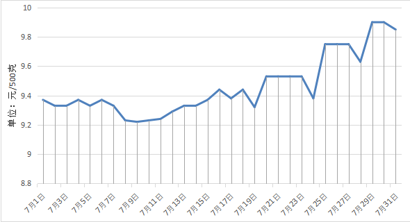 从监测数据来看,猪肉月均价为17.62元/500克,环比上涨7.70%。生猪价格小幅上涨,从7月1日9.37元/500克涨至7月31日9.85元/500克。主要原因是:高温天气导致集团猪企出栏量有所缩减,适重生猪流通数量减少,且散户猪场观望态度较为显著。后市来看,养殖户们的捂栏扛价变得越发显著,生猪出栏量更是处在相对低迷的状态,生猪价格或继续上涨。