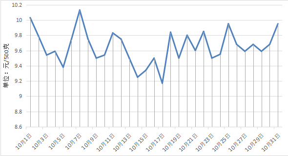 从监测数据来看,猪肉月均价为18.58元/500克,环比下跌2.11%。生猪价格小幅下跌,从10月1日10.03元/500克波动跌至10月31日9.95元/500克。主要原因是:受国庆节效应影响,养殖端出栏积极性提高,供应端增量,而需求端跟进乏力,市场供大于求。后市来看,天气逐渐寒冷,下游需求有所提振,猪价将止跌回稳。