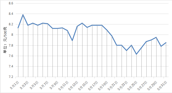 从监测数据来看,猪肉月均价为15.62元/500克,环比下跌1.39%。生猪价格持续下跌,从5月1日8.13元/500克震荡下跌至5月31日7.85元/500克。主要原因是:养殖端生猪出栏积极性提高,但气温升高后终端需求消化迟缓,阶段性供大于求拖累猪价连续回落。从后期来看,虽端午节对下游市场有短时提振,但力度有限,生猪市场仍处于供大于求状态,猪肉零售价格或继续处于低位。