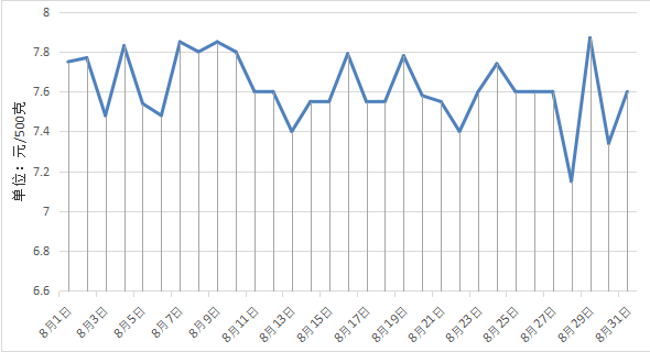 从监测数据来看,猪肉月均价为15.07元/500克,环比下跌0.13%。生猪价格震荡下跌,从8月1日7.75元/500克震荡下跌至8月31日7.60元/500克。主要原因是:8月高温天气持续,终端需求疲软,生猪价格下跌。从后期来看,受开学带动,需求端或小幅增量,猪价或微涨。