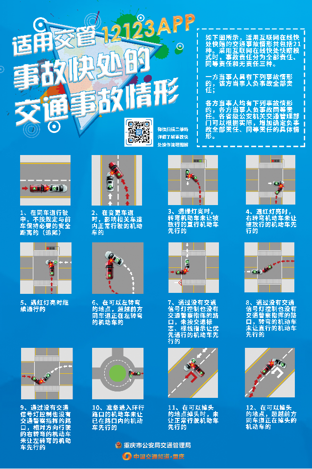 “快处易赔”新机制适用互联网在线快处快赔的21种道路交通事故情形,且符合以下四个条件:一是事故案件属于车险合同约定的保险责任范围;二是双车事故,无人伤及第三方物损,事故车辆可自行驶离;三是事故双方须在渝投保交强险及商业三者险;四是事故双方需提供事故现场影像记录。