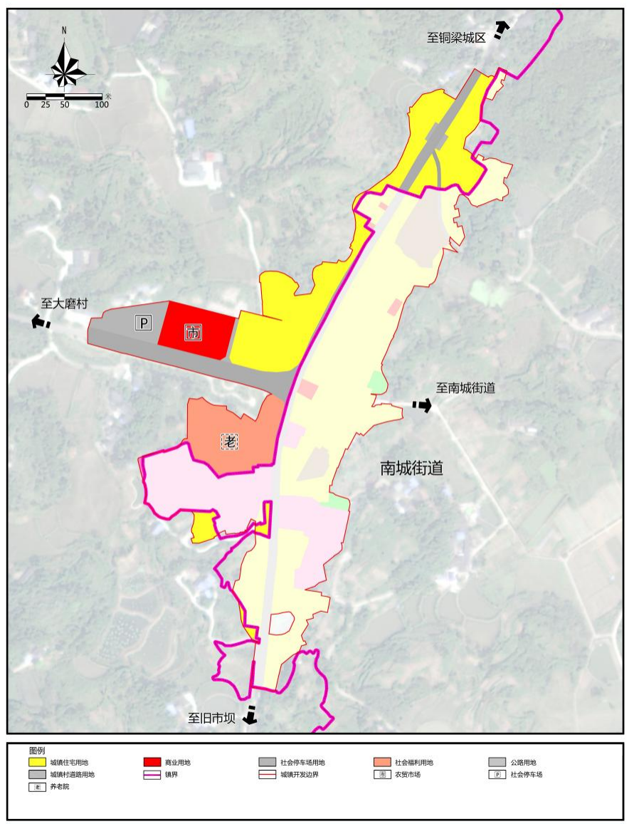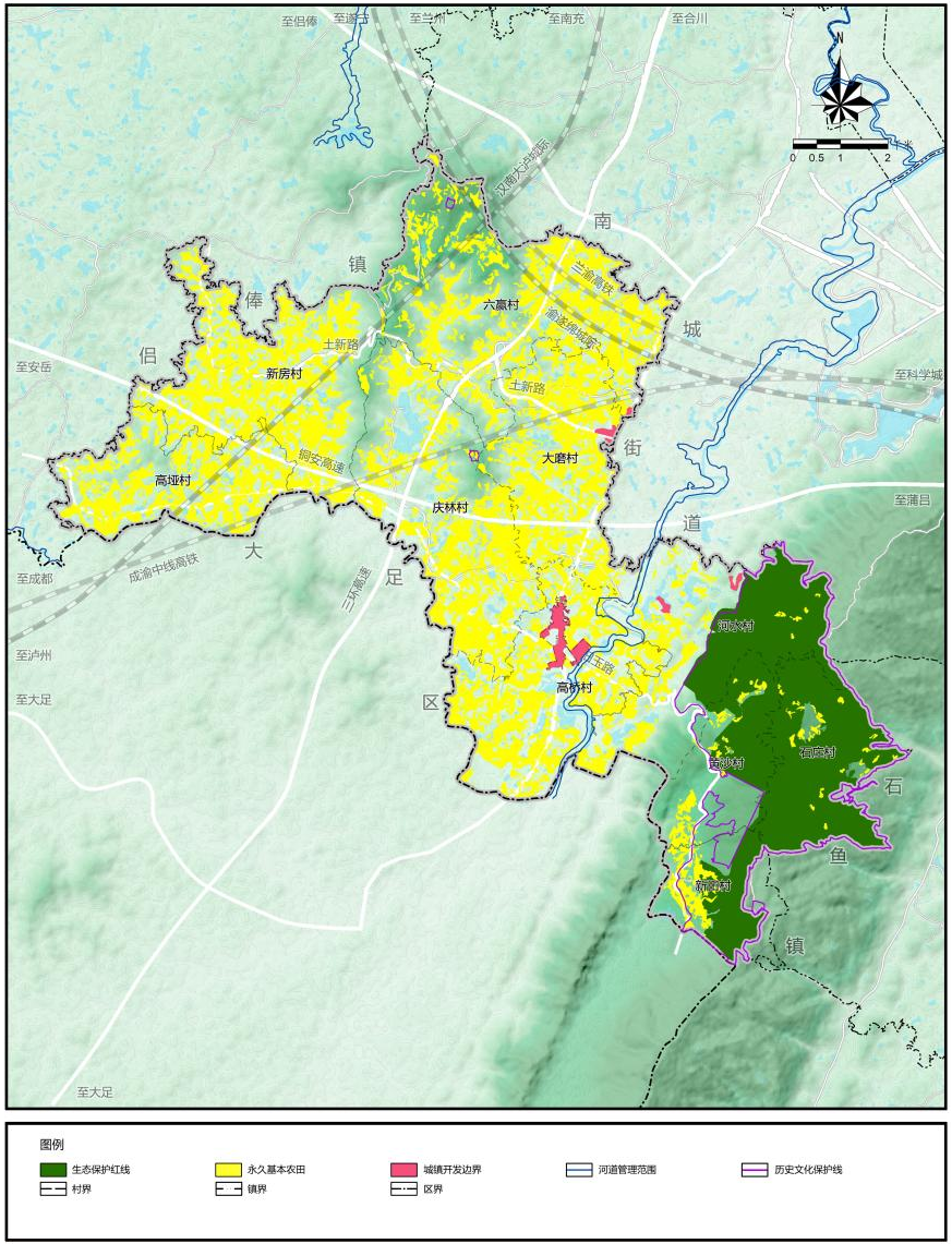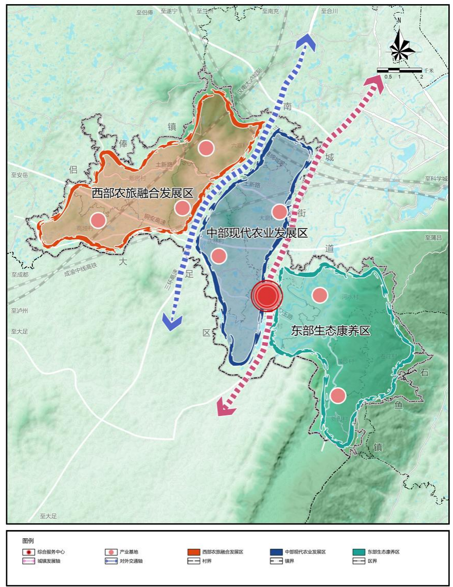 构建“一心、两轴、三区、多点”的总体开发保护格局。“一心”是以商贸居住、公共服务为主的政治文化综合服务核心;“两轴”依托旧市路构建城镇发展轴和三环高速构建的对外交通轴;“三区”为西部农旅融合发展区、中部现代农业发展区和东部生态康养区;“多点”为多个产业基地。