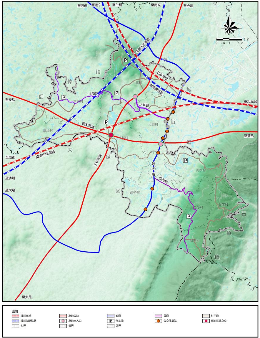 构建“四铁两高三干”对外交通体系,新增成渝中线高铁、兰渝高铁、汉南大泸城际铁路、渝遂绵城际铁路,全面提升铜大路、土新路、旧玉路等级质量,建设“两横一纵两环多联线”内部干路体系,完善社会停车场、客运招呼站等设施布点。