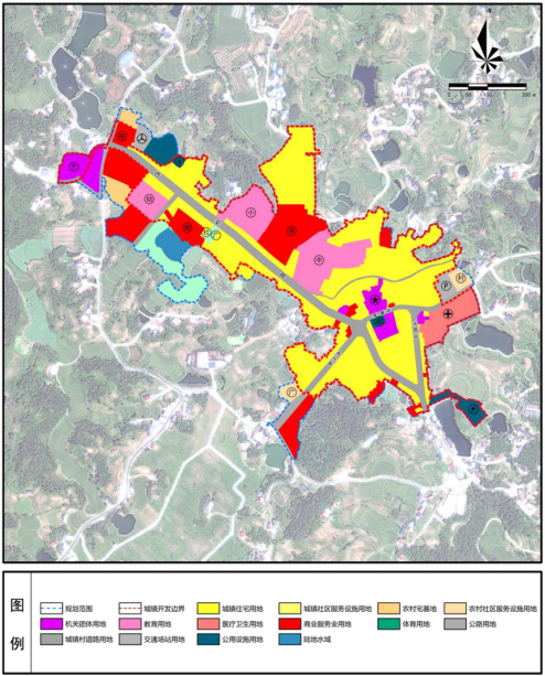 规划镇区远期建设用地面积约0.34平方公里。规划居住用地占建设用地的比例约47%,公共管理与公共服务用地占建设用地的比例约17%,商业服务业用地占建设用地的比例约9%,公用设施用地占建设用地的比例约2%,绿地与开敞空间用地占建设用地的比例约6%。