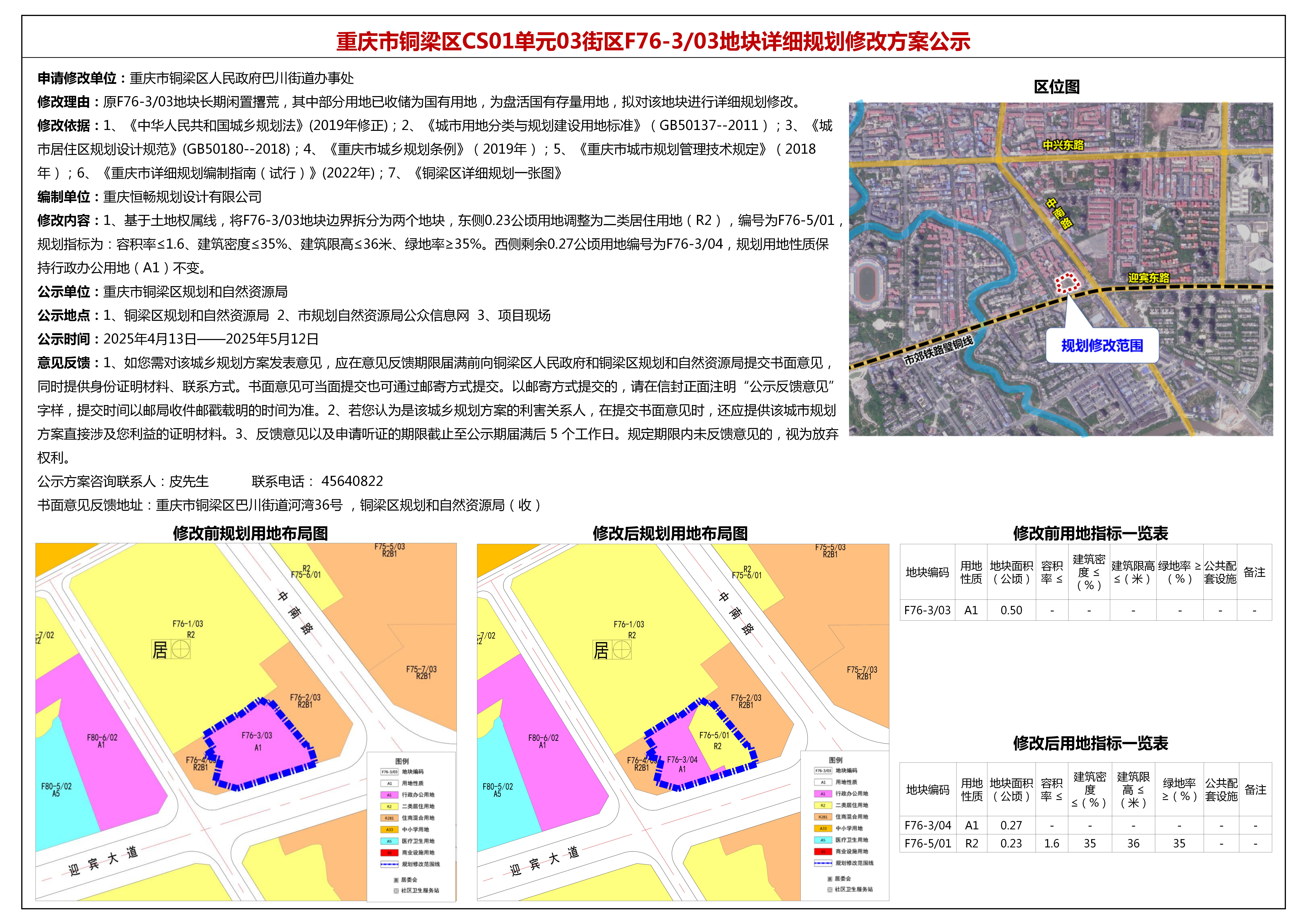 重庆市铜梁区cs01单元03街区F76-3/03地块详细规划修改方案公示