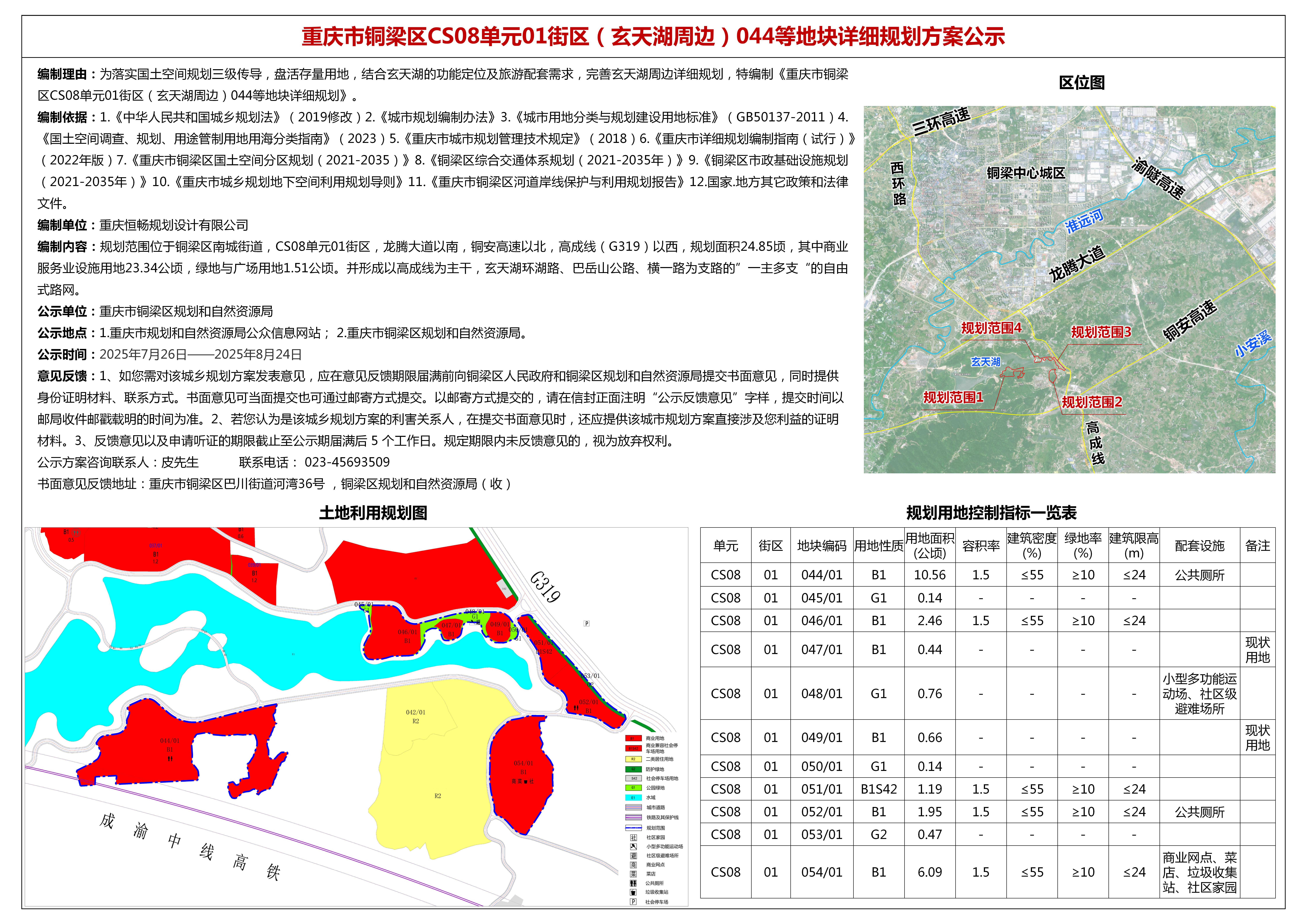 重庆市铜梁区CS08单元01街区(玄天湖周边)044等地块详细规划方案公示