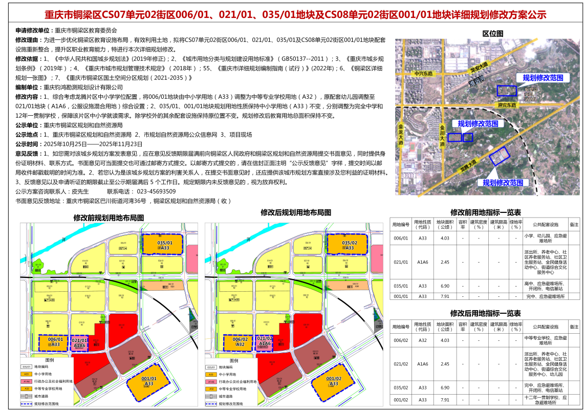重庆市铜梁区CS07单元02街区006/01、021/01、035/01地块及CS08单元02街区001/01地块详细规划修改方案公示