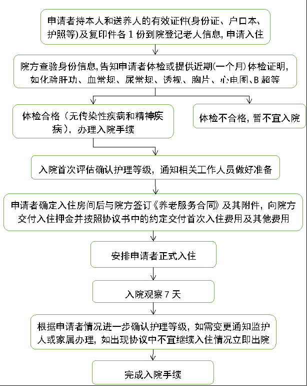 (二)有偿代养对象:遵循自愿原则,由入住对象或其法定监护义务人向自愿入住机构所在辖区各镇人民政府(街道办事处)民政办提出申请,参照一般养老院入(出)院流程办理(详见附件)。